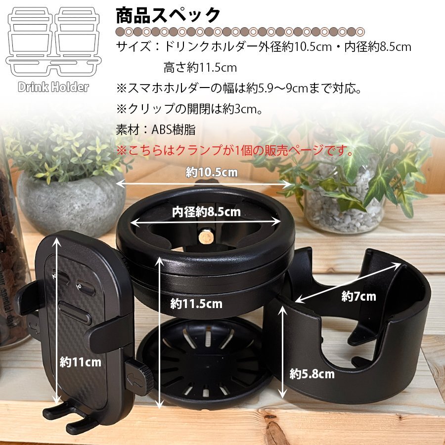 商品名:ベビーカー用ドリンクホルダーTYPEA カラー:ブラック・ベージュ サイズ:ドリンクホルダー外径約10.5cm・内径約8.5cm・高さ11.5cm スマホホルダー幅約5.9~9cmまで対応。 素材:ABS樹脂 生産国:中国 |