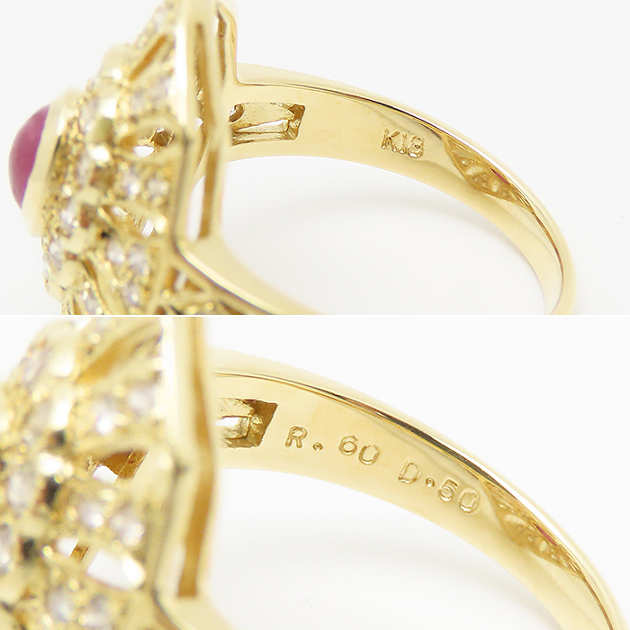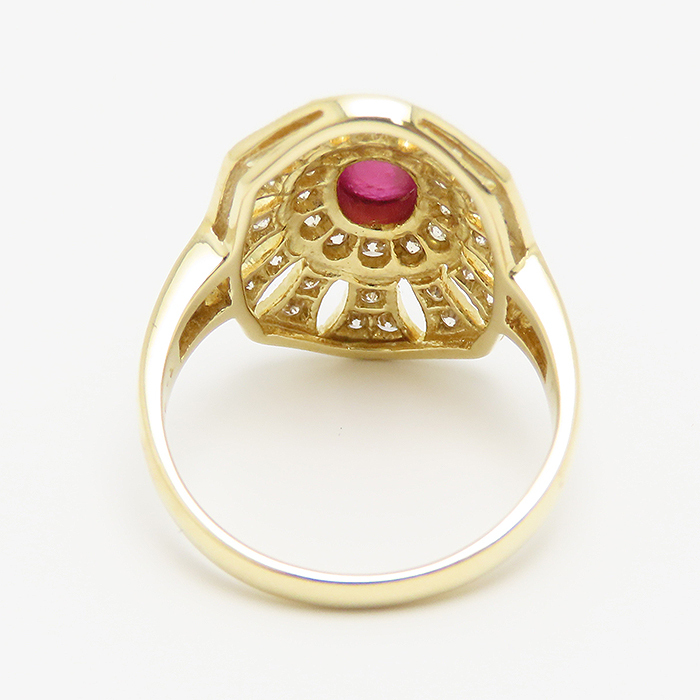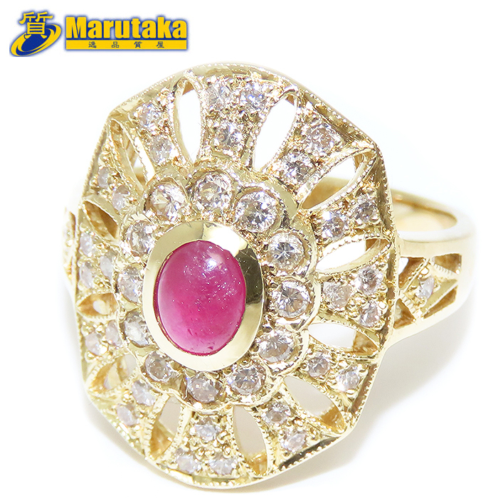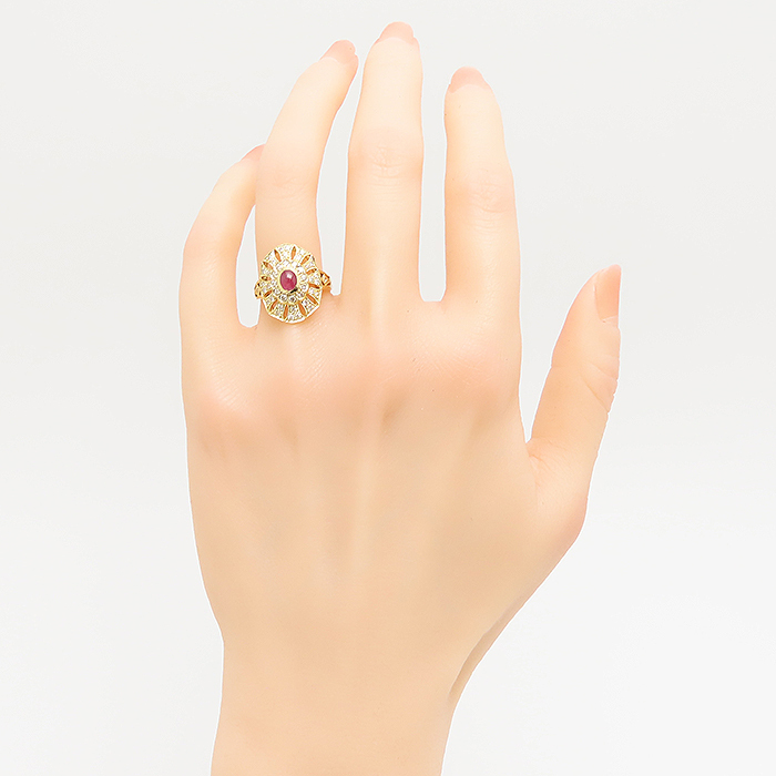 商品説明 | センターにカボションカットのルビー、その周りにメレダイヤがセッティングされたリングです。面が大きく、透かし柄で凝ったデザインの逸品です。 |