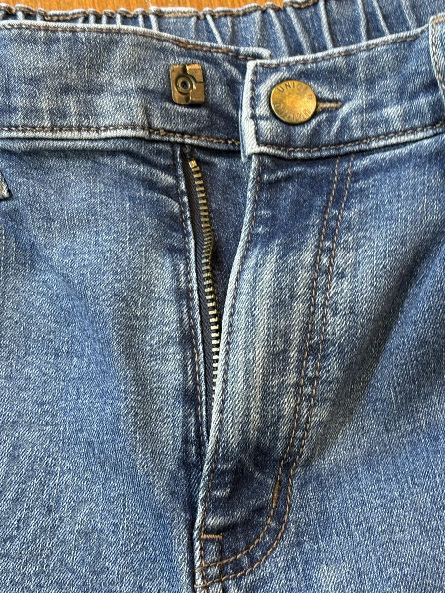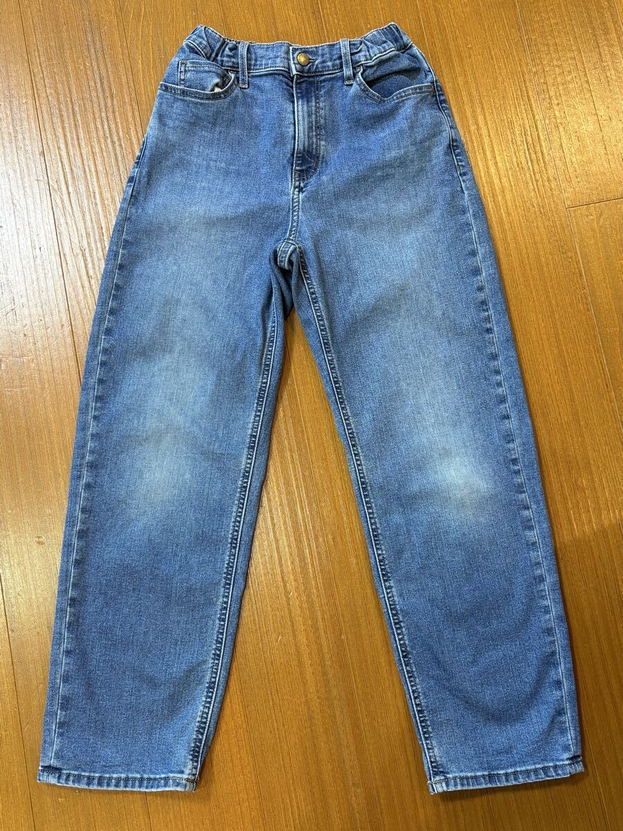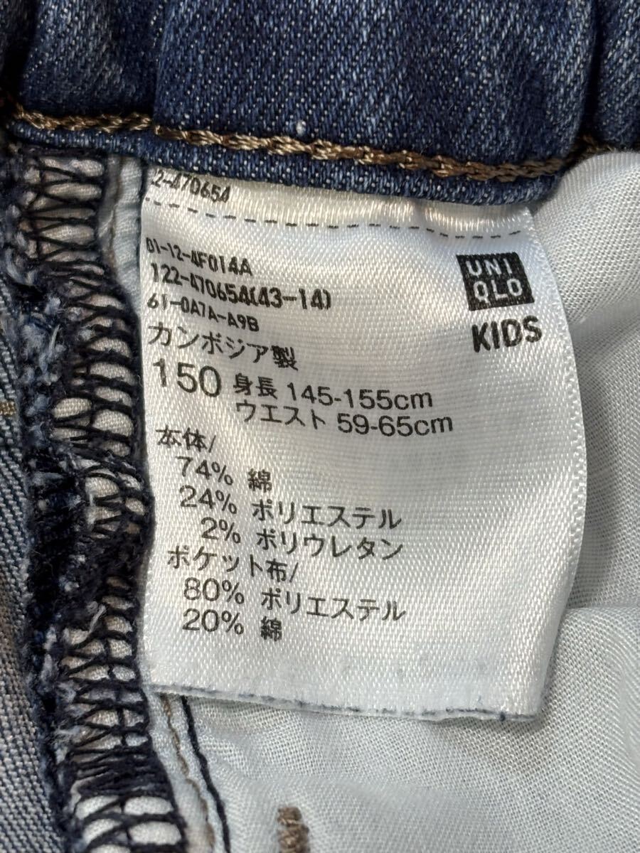 ユニクロのデニムパンツです。サイズは150です。素材は綿74%、ポリエステル24%、ポリウレタン2%です。仕様はファスナー×1、ポケット前後左右×各1ヶ所、ウエストはゴムで調整可能です。同じデニムパンツをもう1点出品しておりますが、サイズ制限により同梱は不可となります。2点ご落札いただいた場合はゆうパケットポスト2個口での発送となりますのでご了承ください。