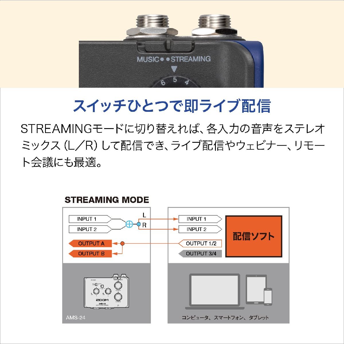 ブランド:ZOOM(ズーム)カラー:ブラックサイズ:小ZOOMAMS-24は、コンパクトで使いやすいUSBType-Cオーディオインターフェースです。わずか180gの軽量設計で、手のひらサイズの本体は持ち運びに最適です。2系統のXLR/TRSコンボ入力とステレオL/RのTRS出力を備え、24ビット/96kHzの高品質なオーディオ処理が可能です。Windows、Mac、iOS、Androidに対応し、音楽制作やライブ配信に最適な機能を搭載。MUSIC/STREAMING切替スイッチにより、用途に応じて最適な信号経路を簡単に設定できます。ウェビナーやリモート会議、DTM制作、ライブ配信など、様々な用途に対応する多機能なオーディオインターフェースです。Windows/Mac/iOS/Android対応、2イン/4アウトのUSBType-Cオーディオ・インターフェース