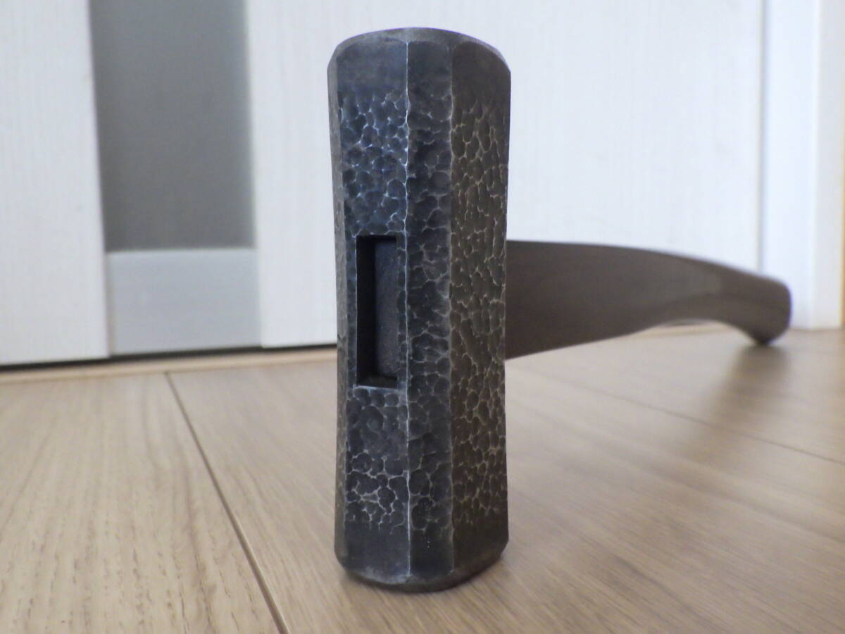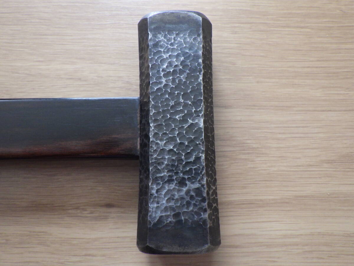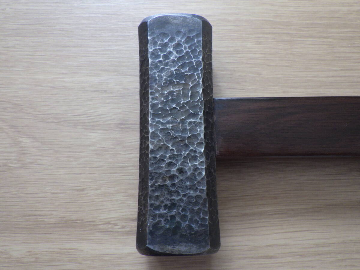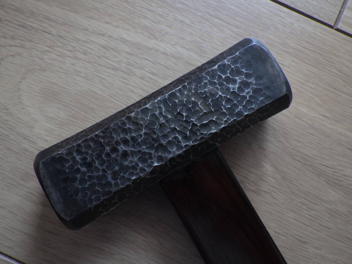 未使用長期保管品の四角玄能(「小平」銘)に黒槌目仕上げを施し、新たに黒檀柄を挿げたものです。(当方で製作する際、両縁の研磨無しを「黒槌目仕上げ」、有りを「槌目仕上げ」と区別しています。)