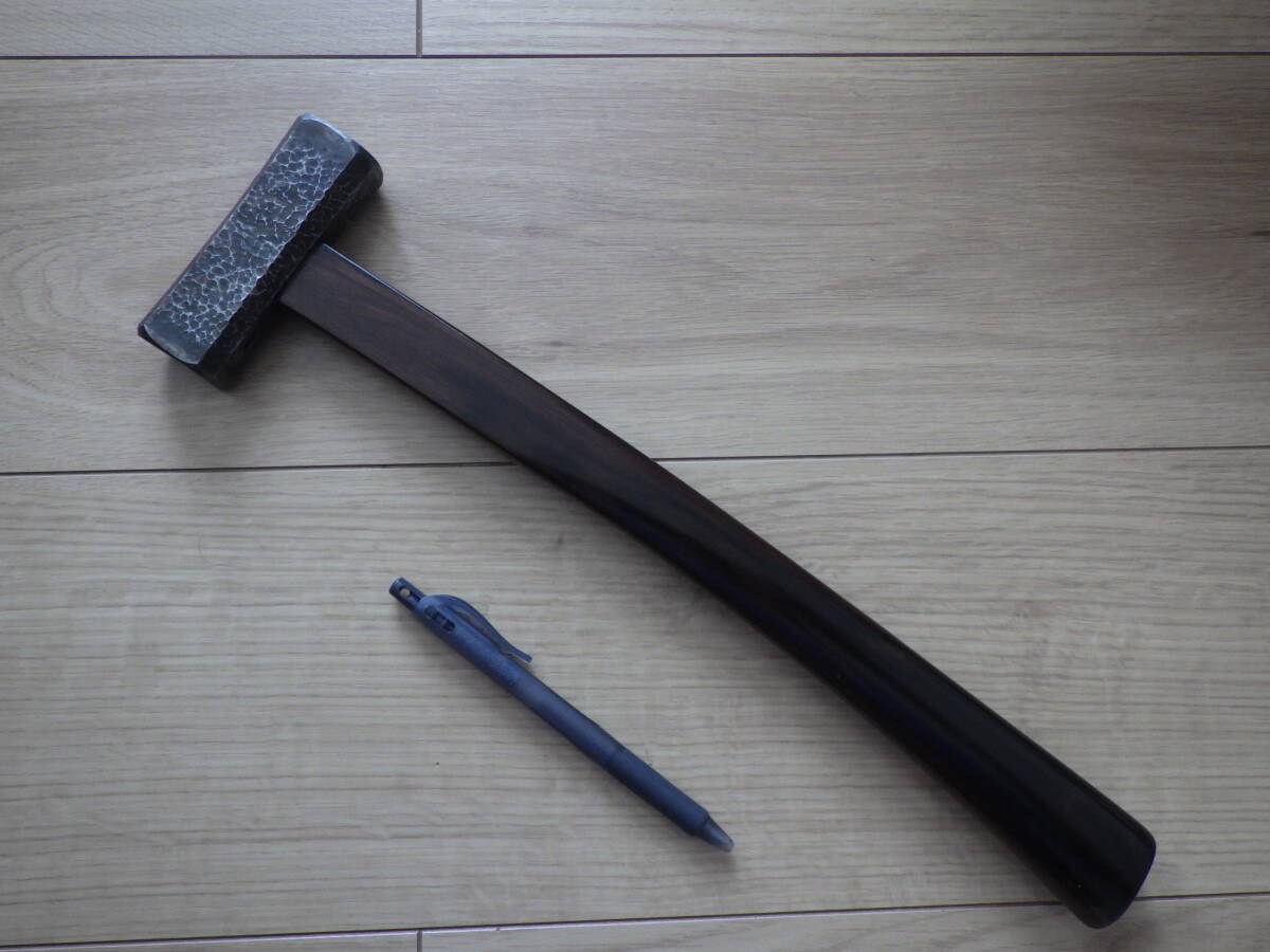 黒檀柄は新たに製作した物です。全体の形状はわずかに曲がり柄で握り部分の断面は逆おにぎり型、柄尻を太め(縦3.5㎝横最大2.8㎝)に成形してあります。玄能の柄は櫃穴の8割以上固く仕込めば楔は必要ないそうですが、こちらの柄も8割程まで固く仕込みましたので、楔は打っておりません。ゆるみが出た場合は増し締め、再調整をお願いします。(中古の楔を1本お付けしますので、適宜お使い下さい。)