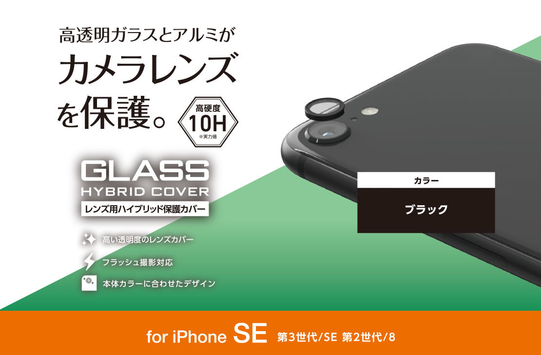 iPhone SE 第3世代の本体カラーに合わせたアルミフレーム部と表面硬度10Hの強化ガラスで、カメラレンズを傷やよごれから守るiPhone SE 第3世代、iPhone SE 第2世代、iPhone 8用カメラレンズ保護カバーです。