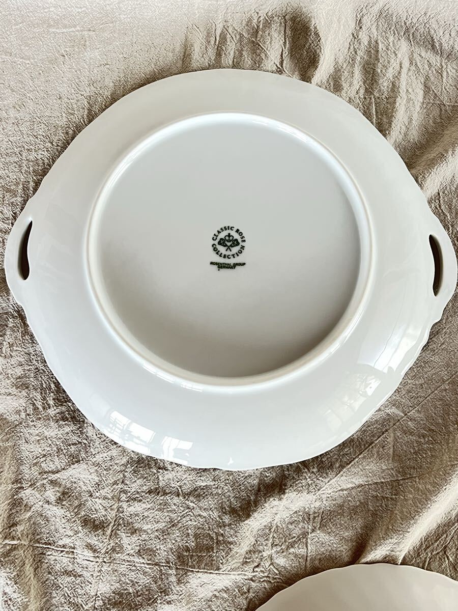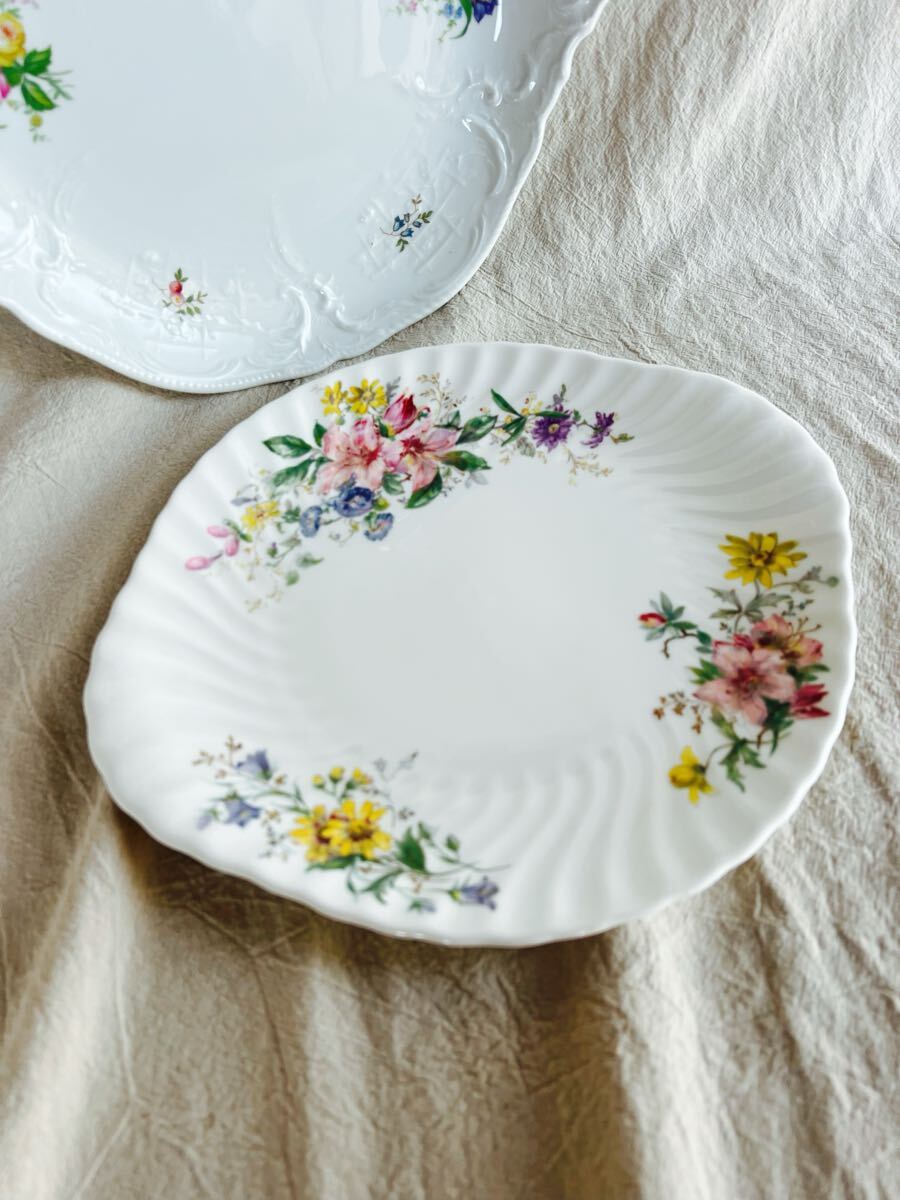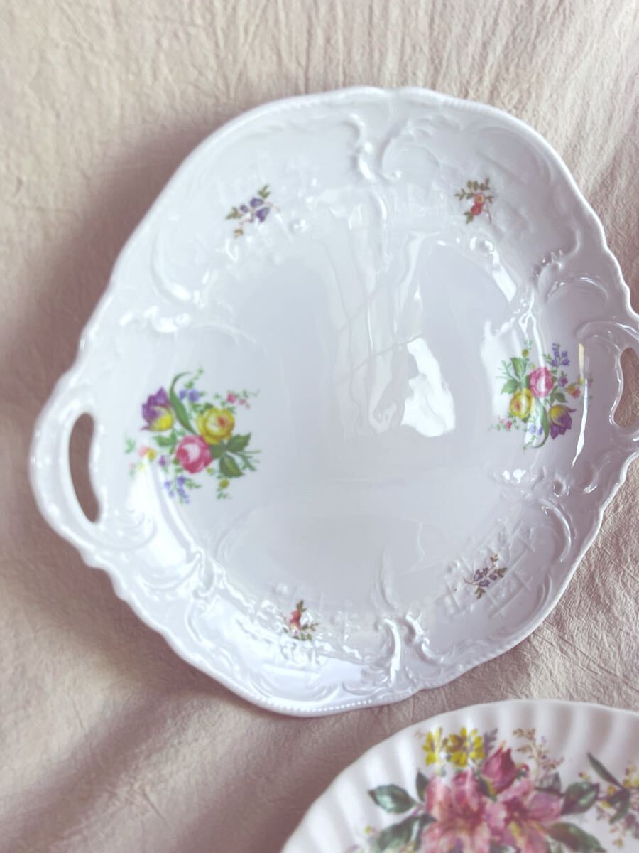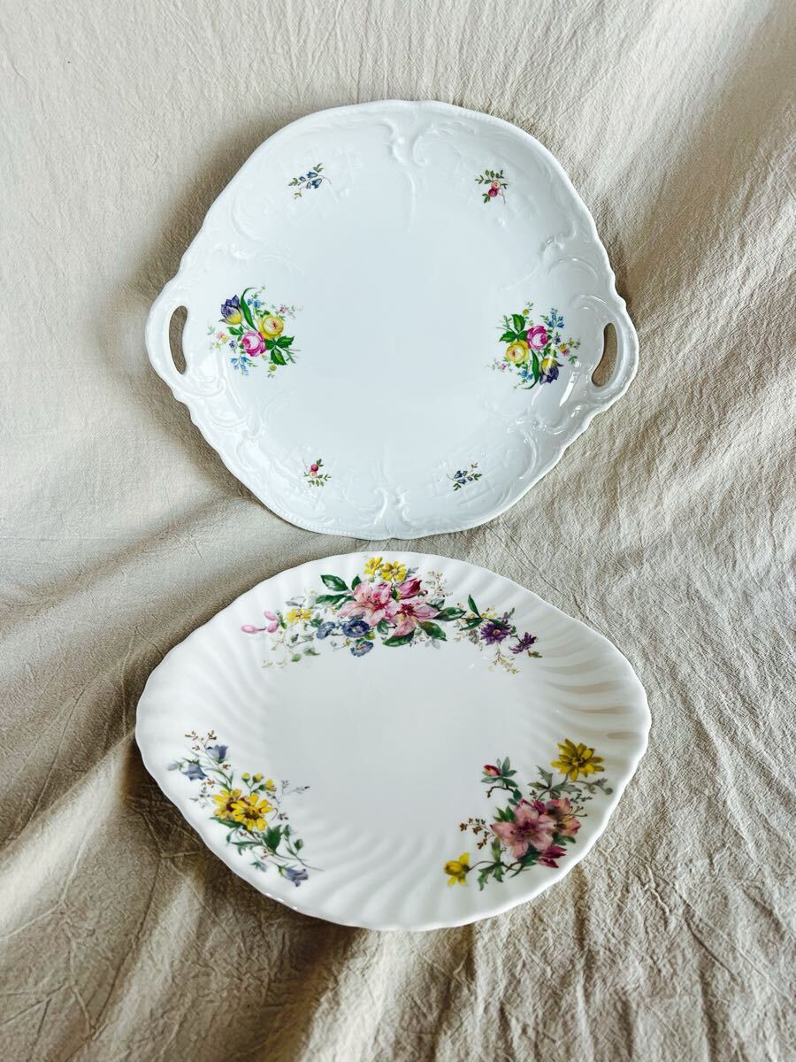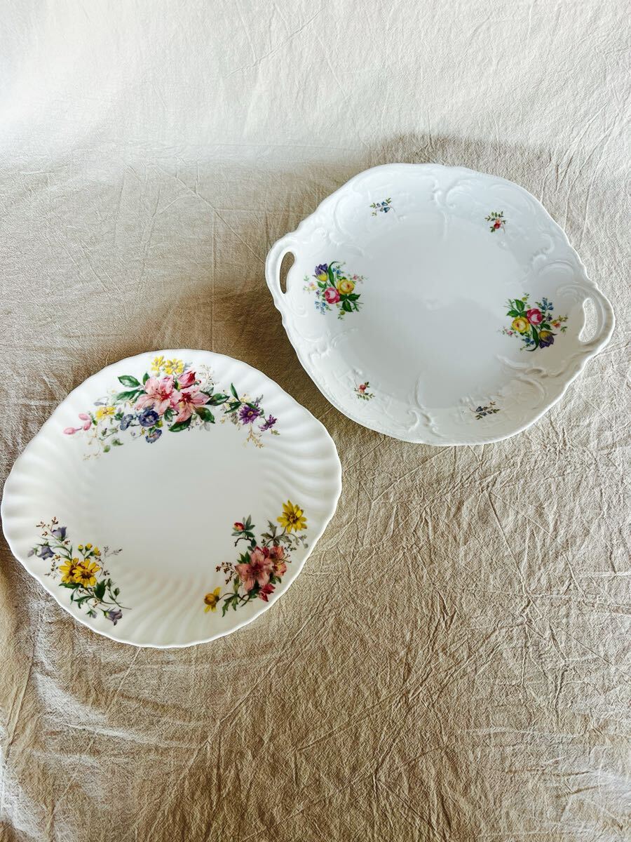 素敵な花柄デザインのプレートセットです。中古です。画像上のローゼンタールはほぼ未使用に近いです。サイズ30×27㎝ アルカディアプレートはよく見ると一部画像の様にキズがあります。サイズ24×27㎝。