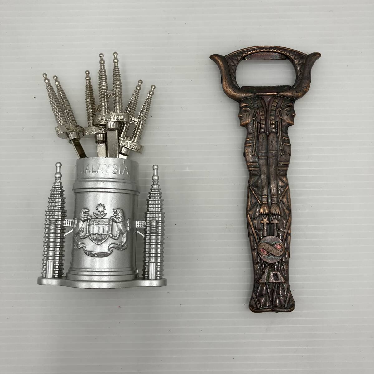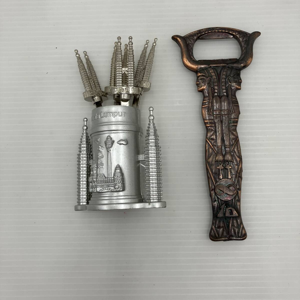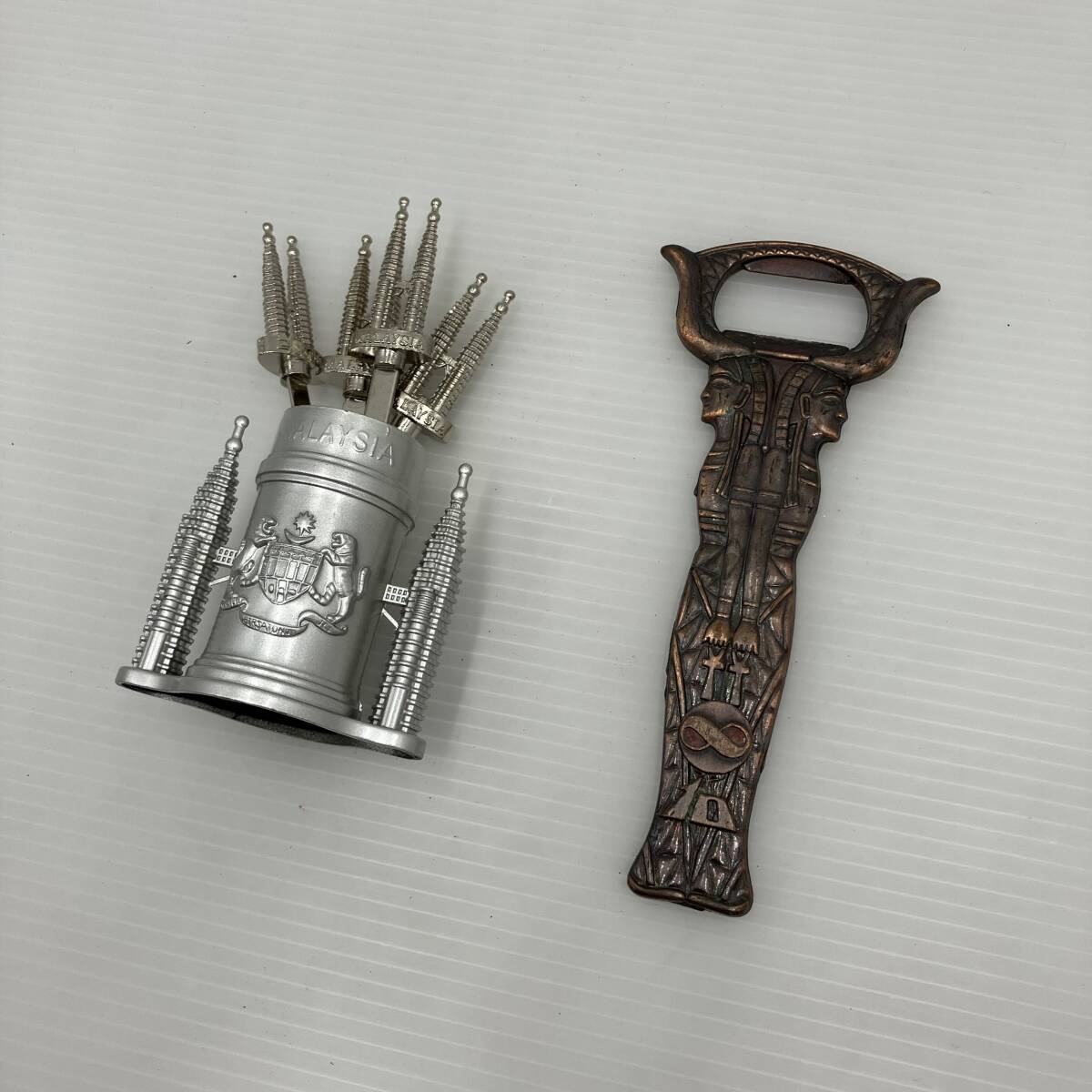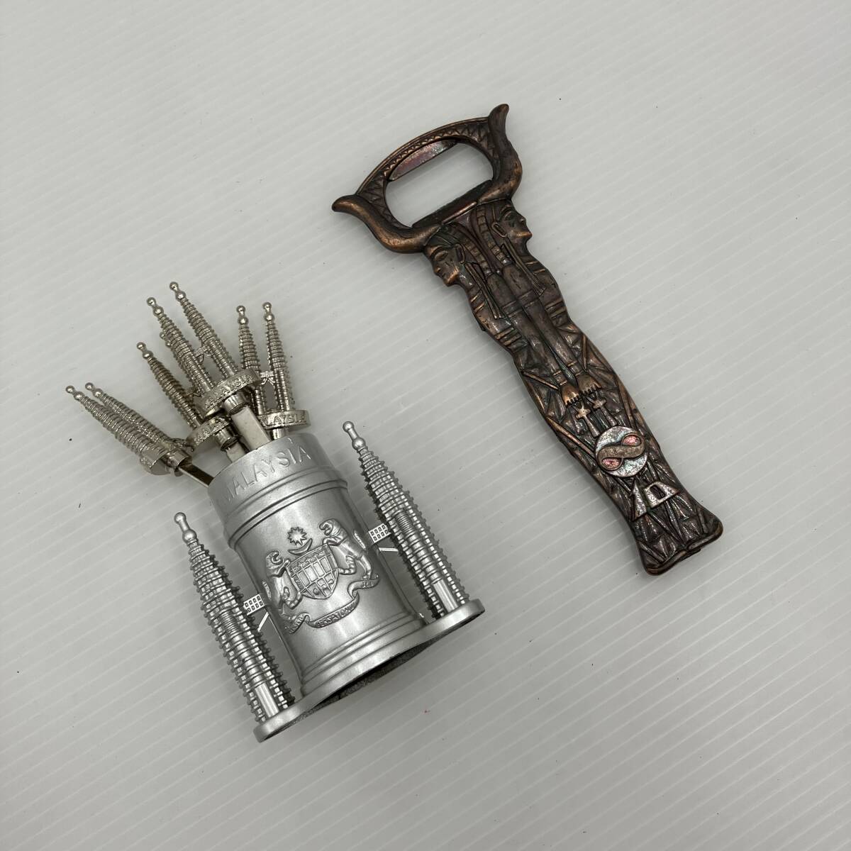 【現状品】エジプトモチーフ 栓抜き 全長13cm/マレーシア ペトロツインタワーモチーフ フルーツピック 8本 キッチン用品 台所用品