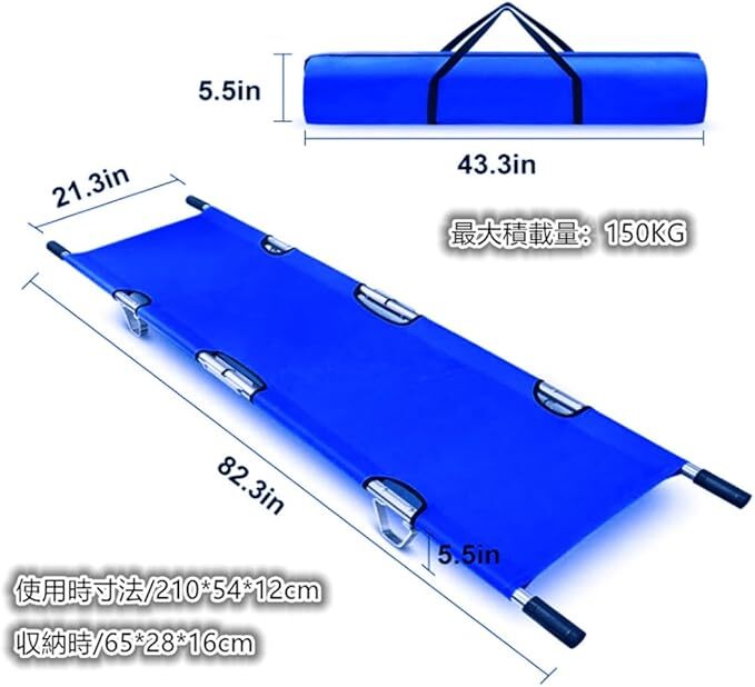 • 収納時はコンパクトな担架ベット。必ず平らな場所で患者さんをのせ、2~4名で把手をしっかり持ち、水平を保ち、患者さんの転落に十分注意してください。使用時寸法/210*54*12cm、収納時/65*28*16cm、耐荷重:150kg。