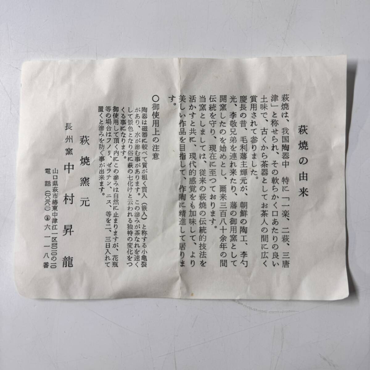 【63875Q】未使用 萩焼 長州窯 中村昇龍作 萩小服茶碗 抹茶碗 茶道具 茶器 共箱 栞 経年保管品 現状品