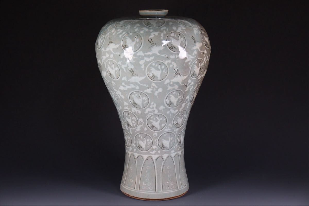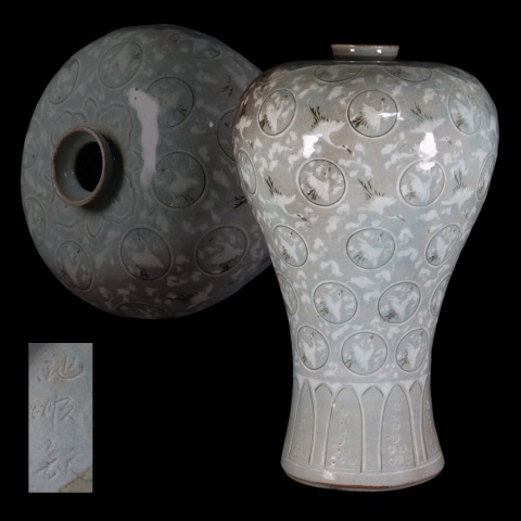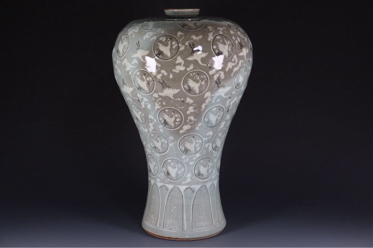 商品説明 | 商品名:蔵出し品 韓国人間国宝 池順鐸 高麗青磁 白黒象嵌 瓶子 付属品:なし。 サイズ:高さ37cm、口径5,8cm、横幅23cm、高台14cm。 状態:無傷になります。 |