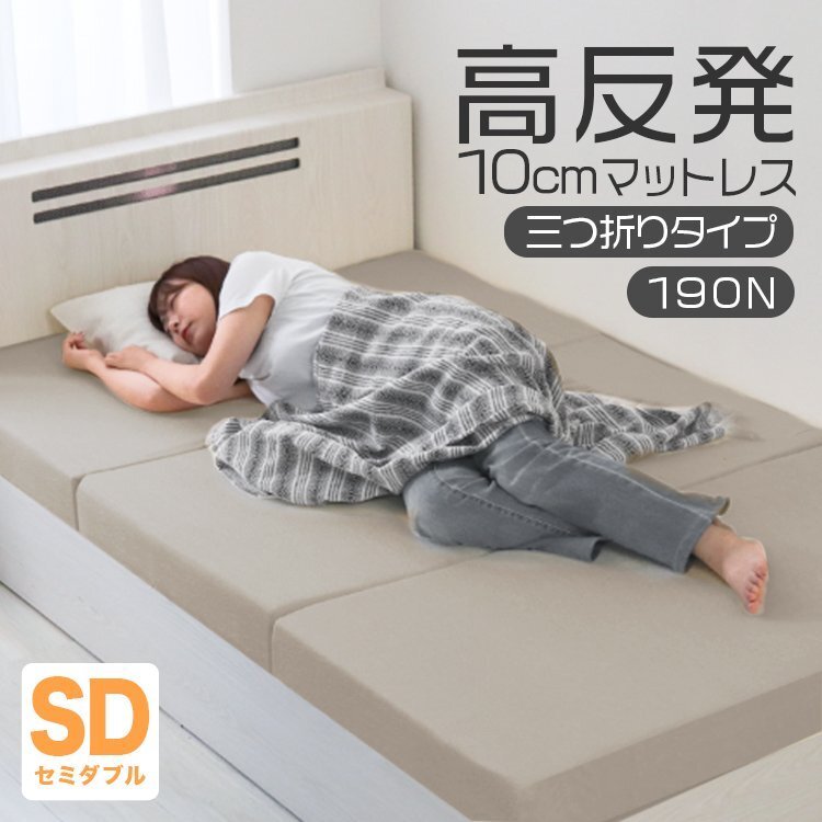厚みたっぷり10cm! 適度な硬さで身体をしっかり支える、三つ折りタイプの高反発マットレスです。 柔らかいマットレスとは違い、身体の沈み込みを軽減した腰に優しい寝心地です。 高反発マットレスのウレタンフォームは弾性が高く、 適度な硬さで身体を支えるので、底つき感もなくへたりにくいマットレスです。 寝返りが多い方や仰向けに寝ることが多い方におススメです。 簡単にたためる三つ折りタイプなので、お部屋で立て置きして日当たりのいい場所で部屋干しが可能! 取り外しやすいL字ファスナー付き洗えるカバーが付属しています! ■商品コード:FEB003WG ■商品仕様 カラー:ホワイトグレージュ サイズ(約)195cm×120cm×10cm(セミダブルサイズ) ※折りたたみ時:(約)65cm×120cm×30cm 重量(約):7.2kg 素材:高反発ウレタン 、パイル生地 他 硬さ:190ニュートン ■注意事項 ・圧縮梱包されたままの状態で長期間保管した場合、マットレスが復元できなくなってしまいます。 商品到着後、1週間以内に必ず圧縮から開放をして頂くようにお願いいたします。 ・マットレスは約1-2日で復元します。気温や温度により3-14日かかる場合もあります。 ・製品の臭いが気になりましたら、風通しの良いところで脱臭してください。 この臭いは素材のウレタンによるもので無害です。臭いに敏感な方は十分ご検討の上、ご購入をお願いいたします。 ・マットの硬さは温度によって変わってきます。また、硬さの感じ方には個人差があります。 ・カバーは取り外して洗濯ができますが、マットレス本体は洗濯しないでください。 ・生産ロットによって復元率・ニュートンに差異が生じる場合があります。 ・商品は、モニターによって色合いが異なって見える場合があります。 ・仕様・デザインは改良のため予告なく変更することがあります。 ■保障期間 7日間 ※商品到着後7日以内の初期不良・破損のみご対応させていただきます。 【新品未使用品です】 |