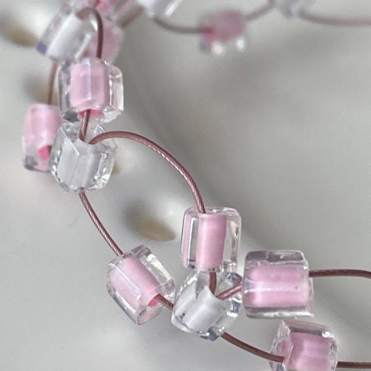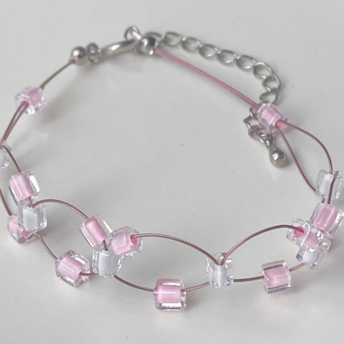 ブレスレット キューブビーズ ピンク クリスタル ワイヤー シルバー かわいい 美品☆vintage jewelry accessories F0118