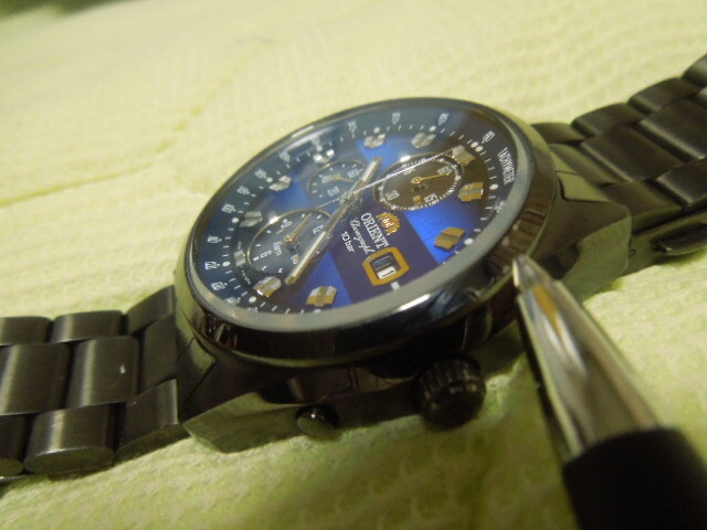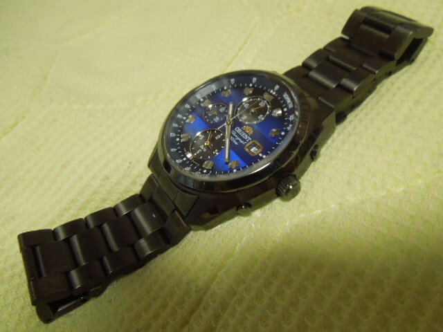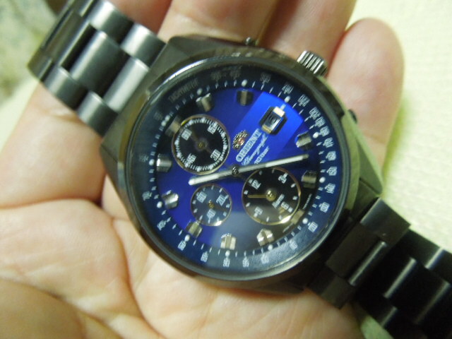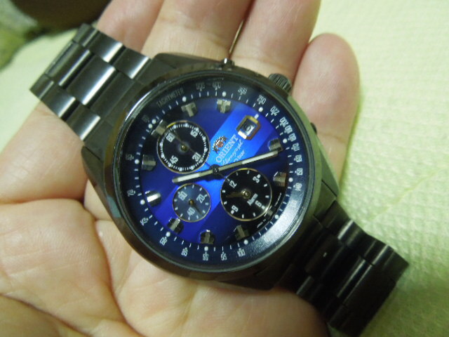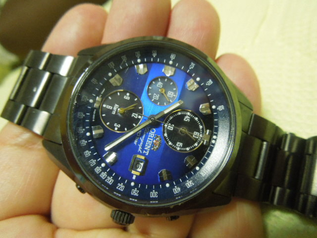 オリエント ネオ’70 ソーラー 稼働中 腕回り17.5cmほど。ブルーのグラデーションがきれいです。