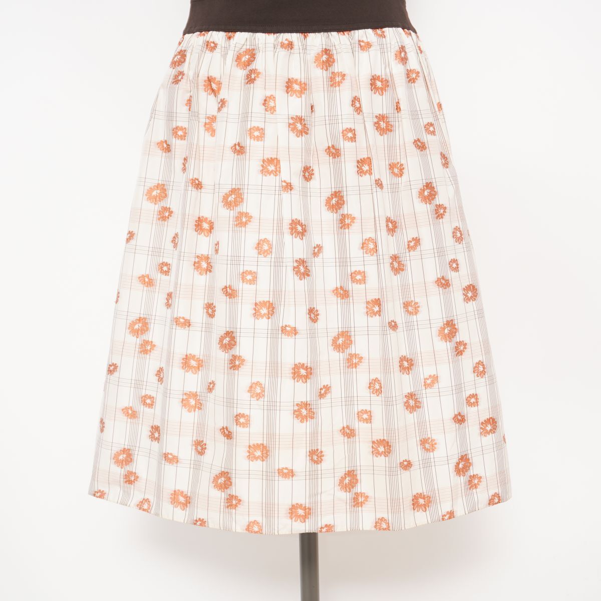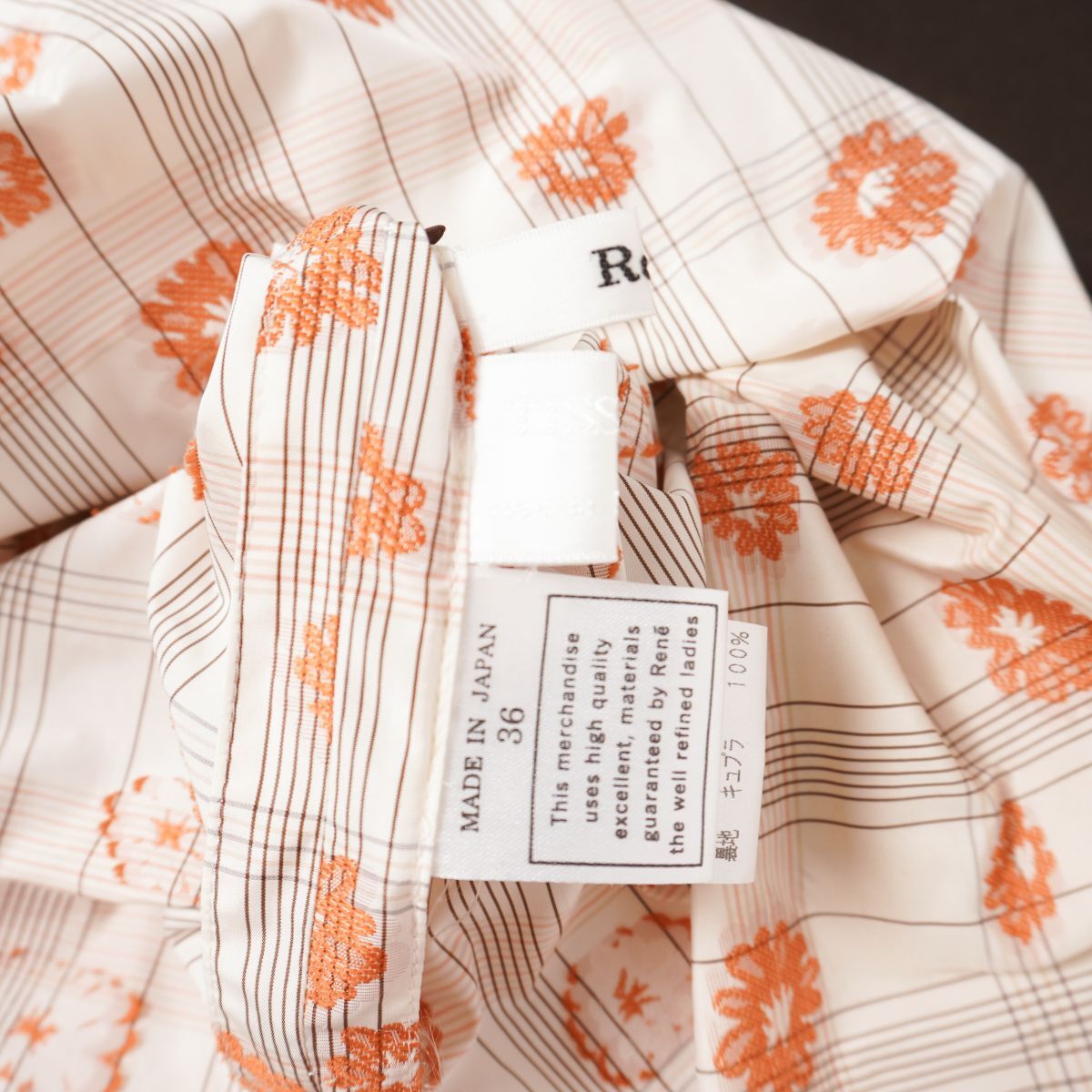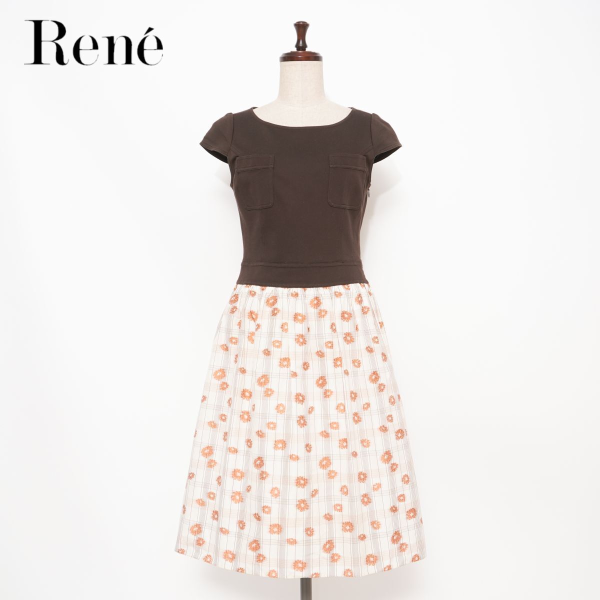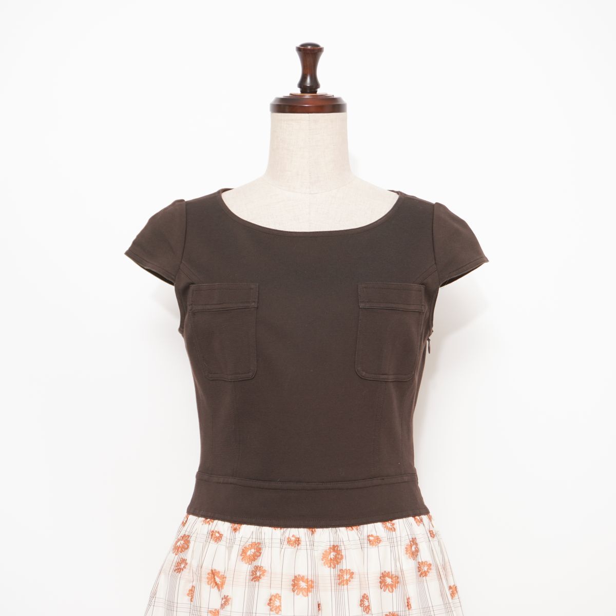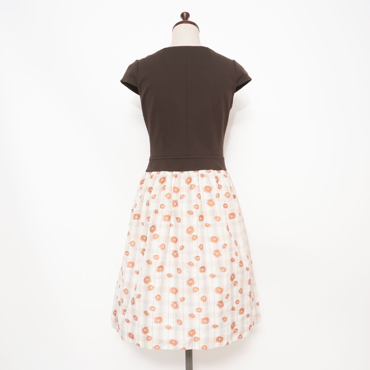 Ren ルネ 異素材ドッキングワンピース 半袖 花柄 チェック柄 フレアスカート 日本製 ブラウン 茶色 オレンジ サイズ36*GD377