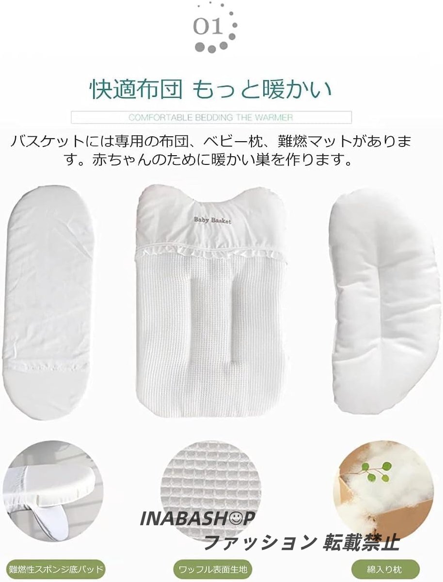 【洗える】ベビーベッドの全部配件は洗いでき、バスケットは洗う必要がないが、湿タオルで拭いてもいい。ベビーバスケットは天然素材で絡むことから、防潮を注意してください。