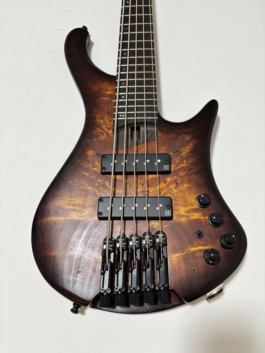 リビングやデスクサイドにぴったりな杢目TOPのEHBショートスケール5弦モデル。