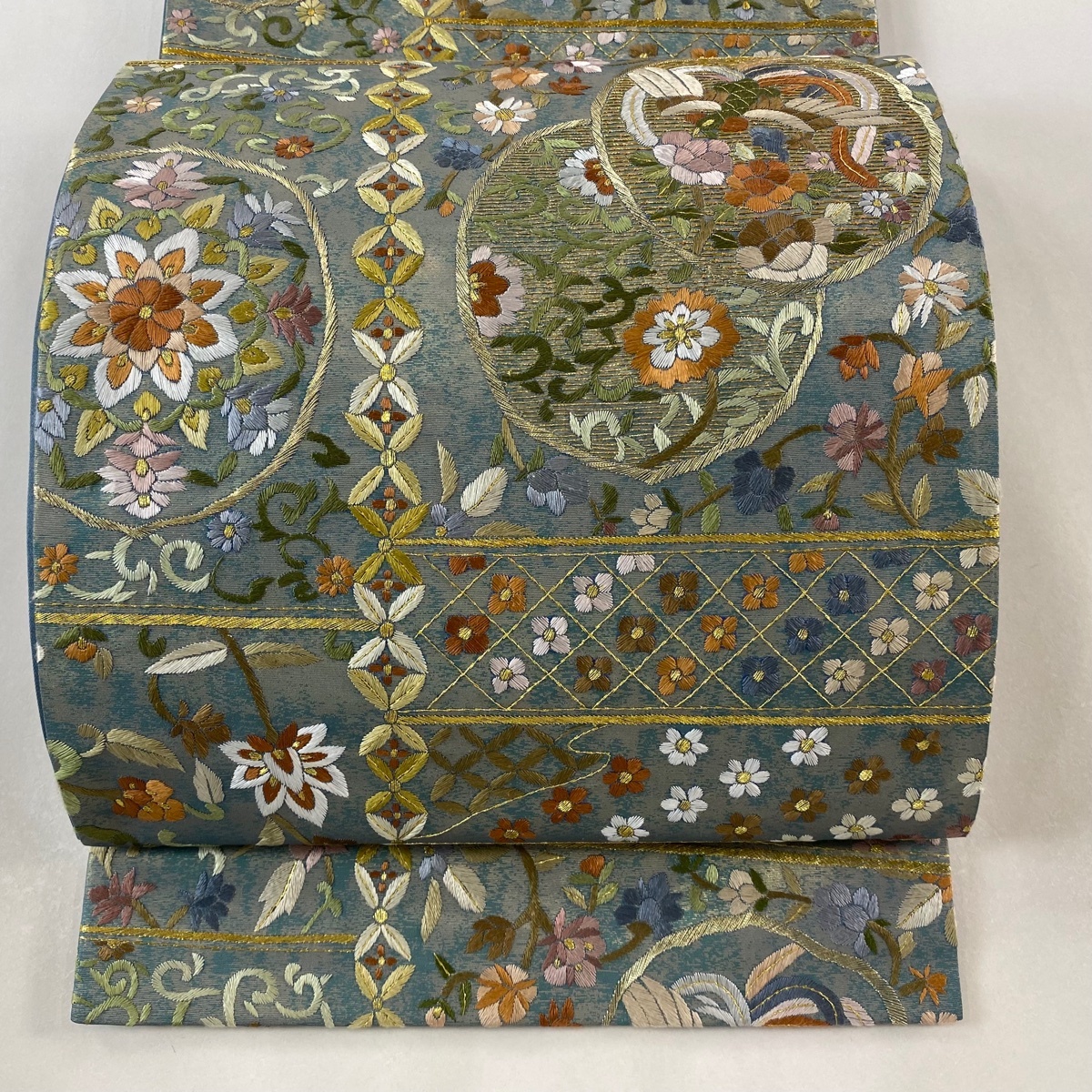 | 袋帯 美品 逸品 花鳥 草花 刺繍 金糸 灰緑 六通 正絹 【中古】 |