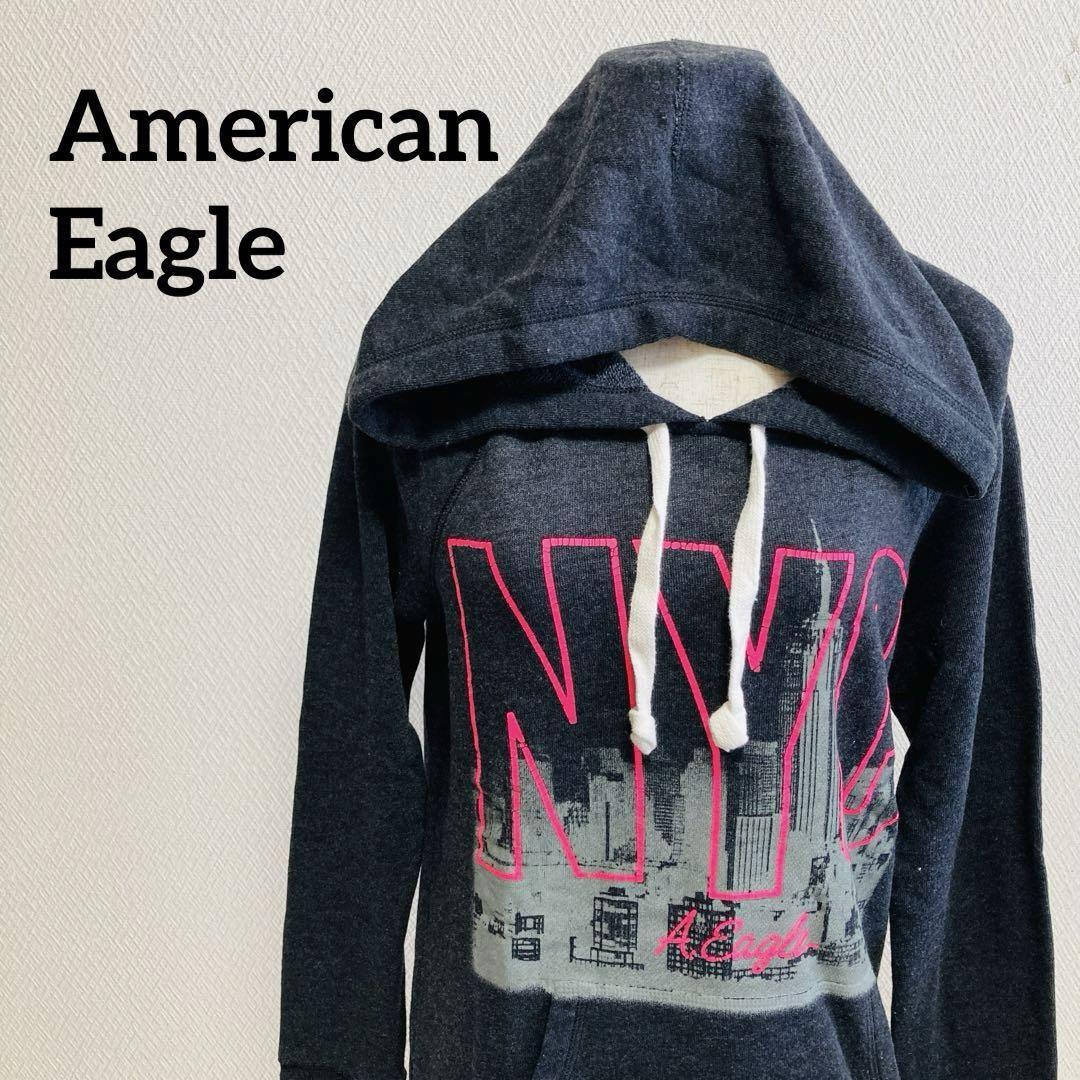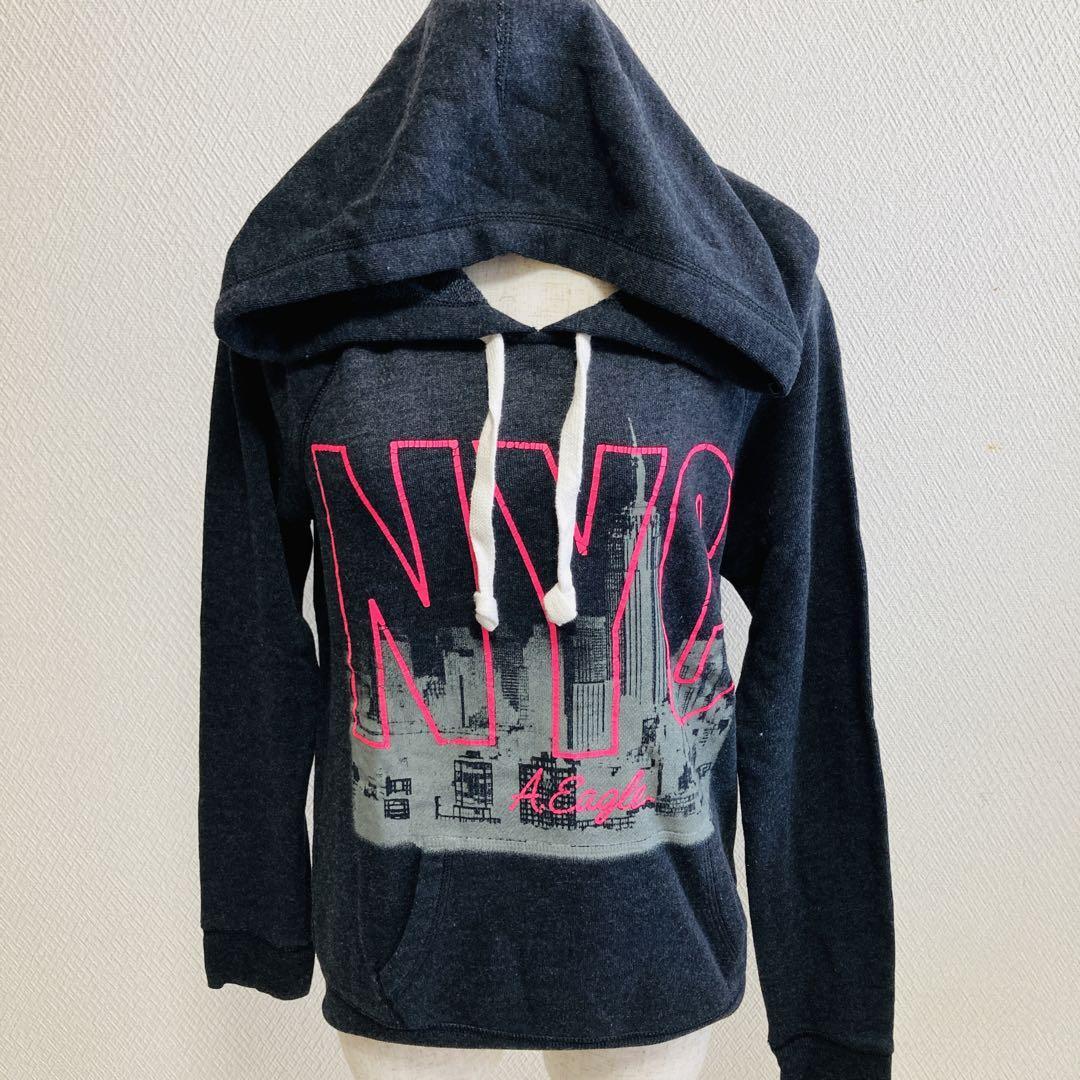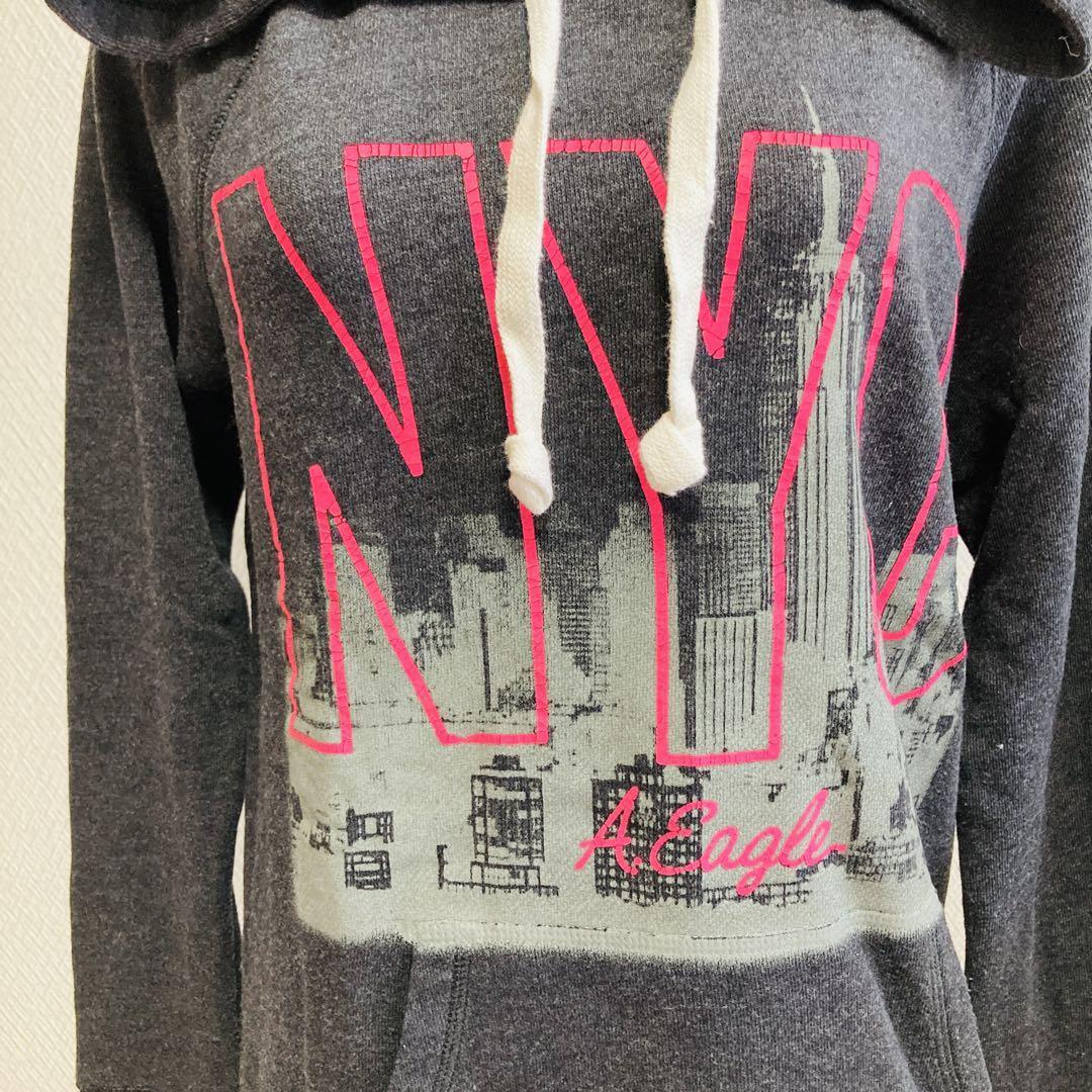 AMERICAN EAGLEのダークグレーのフード付きパーカー、NYCグラフィックプリントデザイン。