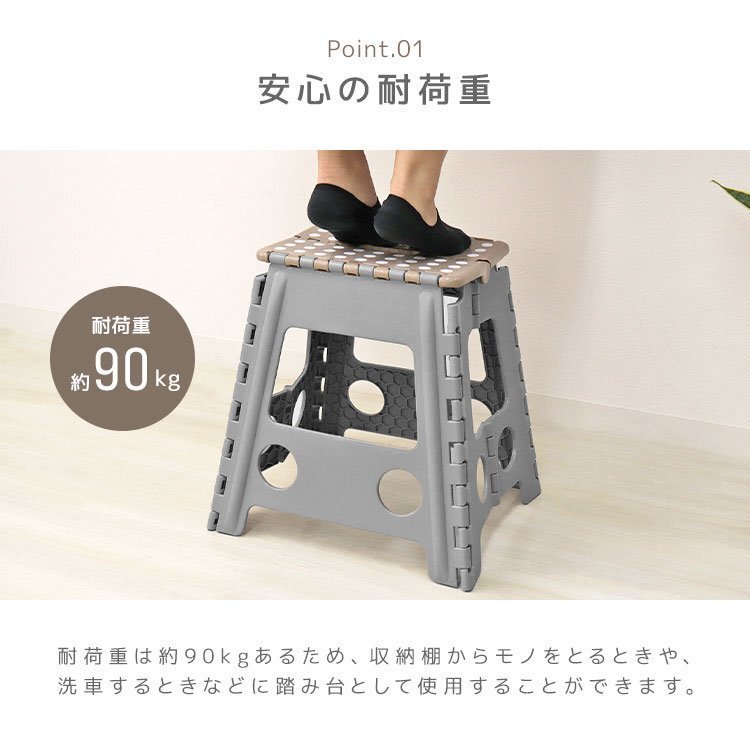 \おうちに1台あると便利/ 組立簡単!踏み台や折りたたみの椅子として、人気のスツールです! 耐荷重は90kg!なので、大人の方が乗っても安心! 折りたたむとカバンのようなカタチになるので、持ち運びもラクラク。 こんな時にも大活躍! ・キッチンで高いところのものを取ったり ・玄関で靴をはくときにちょっと腰掛けたり ・野外に持ちだしてキャンプやスポーツ時の椅子としても 洗車をする時の踏み台として、車に常備しておくのも良いです! 可能性無限大!あなたの生活スタイルにあわせてスツールをご活用ください!! 【商品詳細】 カラー:グレージュ×グレー サイズ(約) ・使用時:幅39cm×奥行32cm×高さ39cm ・折りたたみ時:幅39cm×奥行4cm×高さ52cm 重量:(約)1.5kg 耐荷重:(約)90kg 素材:ポリプロピレン樹脂(PP)+EVA樹脂 ※転倒やケガにつながる恐れがありますので必ず、平坦な場所でのみご使用ください。 ※折りたたみ時に各部に手を挟まないよう、十分にご注意ください。 ※商品を使用して発生した事故・トラブル・破損等につきましては一切の責任を負いかねます。 |