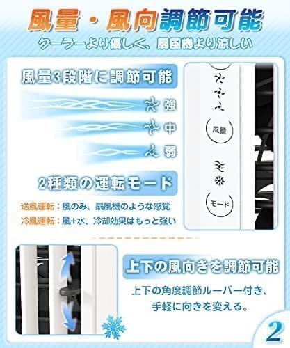 【風量・風向調節可能&2種類の運転モード】風量は弱・中・強で3段階調節可能。可動ルーバーで上下の風向きを変える。送風運転・冷風運転に切替可能。送風運転(送風のみ)は、換気の効率を上げ、蒸し暑い梅雨でも活躍。冷風運転(風+水)は、繊細なミストも噴出、一気に涼しくなる。猛暑日で氷もいれ、冷却効果はさらに強くなる。