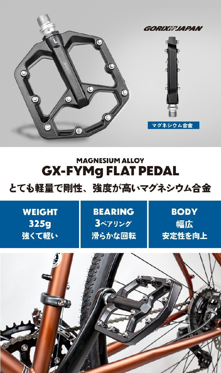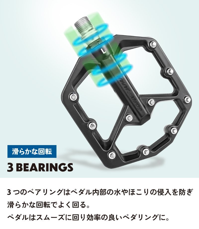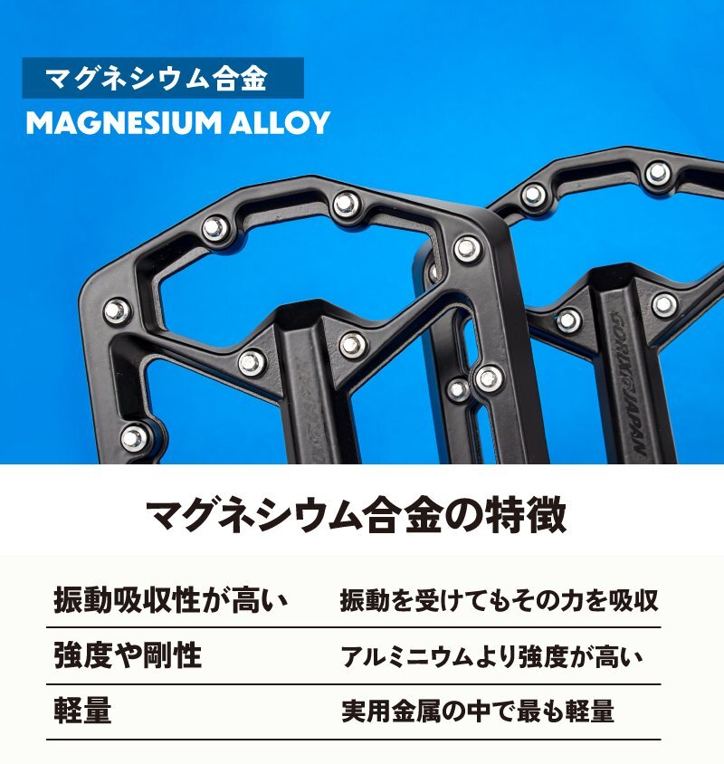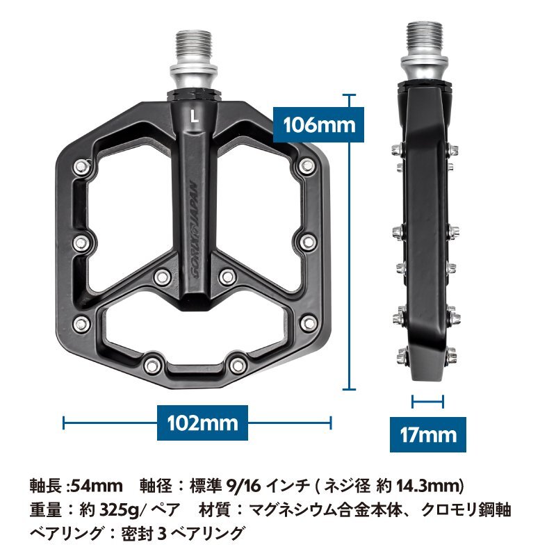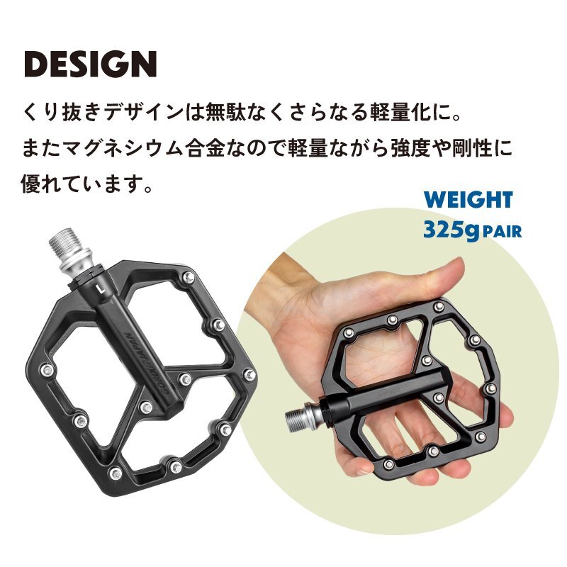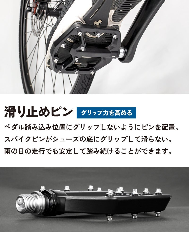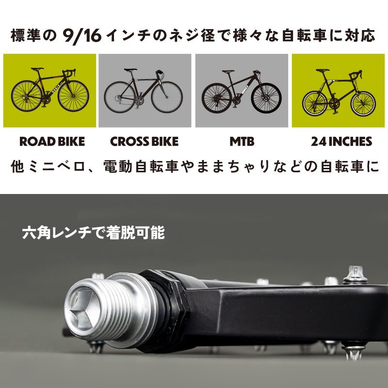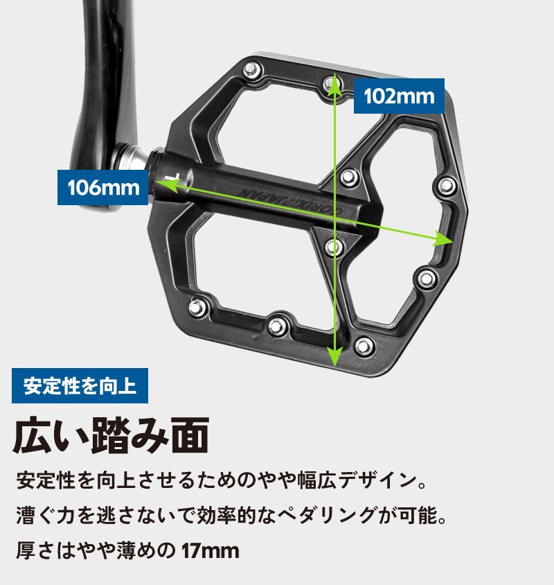 このペダルは、マグネシウム合金を使用したペダルで軽量ながらも強度と剛性に優れており、走行時のパフォーマンスを最大限に引き出すことができます。 また、ワイドな大きい踏み面は足をしっかりと踏めるため、安心感をもたらします。 さらに、ペダル表面にはグリップ力を高める突起した滑り止めピンがあり、靴のソールをキャッチし、足を滑らせるリスクを軽減します。 雨の日の走行でも安定して踏み続けることができます。 ペダルには3つのベアリングが搭載されており、滑らかな回転を実現します。漕ぎやすく、快適な乗り心地を提供します。 主に街乗りや自転車通勤など、足を付く回数が多いライドに最適です。また、ロードバイクやクロスバイク、MTB、電動自転車など、様々な自転車に取り付けることができます。 [マグネシウム合金] 振動吸収性が高い(振動を受けてもその力を吸収) 強度と剛性(アルミニウムより強度が高い) 軽量(実用金属の中では最も軽量) [広い踏み面] 安定性を向上させるためのやや幅広デザイン。 漕ぐ力を逃さないで効率的なペダリングが可能。 厚さはやや薄めの17mm。 [密封3ベアリング] 3つのベアリングはペダル内部の水やほこりの侵入を防ぐ。 滑らかな回転でよく回る。ペダルはスムーズに回り効率の良いペダリングに。 [滑り止め] ペダル踏み込み位置にグリップしないようにピンを配置。 スパイクピンがシューズの底にグリップして滑らないようにします。 [デザイン] くり抜きデザインは無駄なくさらなる軽量化に。 またマグネシウム合金なので軽量ながら強度や剛性に優れています。 [カジュアルに] 通勤・通学や街乗り、ツーリングにマルチに使える。 六角レンチで交換可能なのでペダルの取り付けも簡単に。 (※ペダル取付け時は固結防止のためグリスを塗布する事をおすすめします。) 商品内容ペダル左右セット サイズ長さ102x幅106x厚み17mm、軸長54mm 軸径標準9/16インチ(ネジ径 約14.3mm) 重量約325g/ペア 材質マグネシウム合金本体、クロモリ鋼軸 ベアリング密封3ベアリング ※使い始めのペダルは回転が渋くなっている事がございます。特に冬場は内側のグリスが硬くなり、通常より渋くなってしまいますが ご使用されるうちに馴染みが出て軽くなります。 |