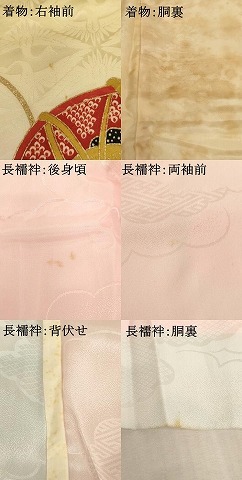 | 着物【正絹】の状態は接写画像のように右袖前に薄い汚れ、胴裏にシミがございますが その他特に目立ったシミ汚れなどもなく大変良い状態です。 長襦袢【化繊・半衿刺繍】の状態は接写画像のように後身頃・胴裏に汚れ、両袖前に薄い汚れ、背伏せにシミがございますが その他特に目立ったシミ汚れなどもなく大変良い状態です。 大変上質な逸品になりますので 是非胴裏を交換されてお召しになられてはいかがでしょうか。 お安く出品致しますので、是非この機会にいかがでしょうか?
