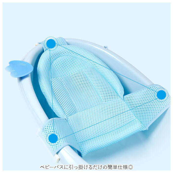 | 商品説明 | ・・ママの腰の負担も軽減!首座り前の沐浴に活躍する沐浴ネット♪ ・ベビーバスに引っ掛けるだけの簡単仕様◎ ・赤ちゃんの上半身をサポートしてくれるから、赤ちゃんもママも無理なく沐浴。 ・サポートがあるだけで、パパも自信がつくから積極的に協力してくれるかも♪ ・表面はメッシュで肌触りもサラッと快適。 ・コンパクトに折り畳めるので、帰省のお供にも★ |