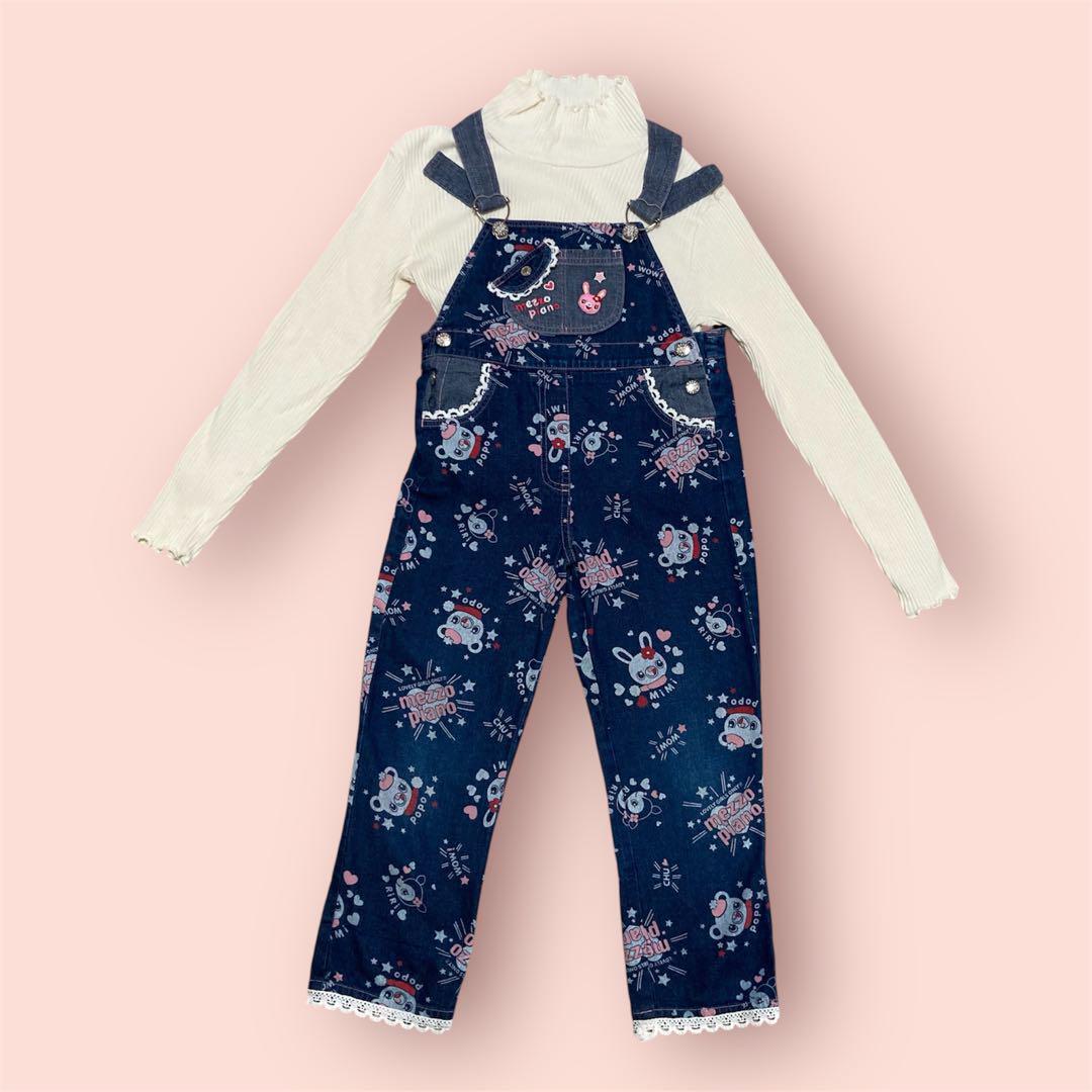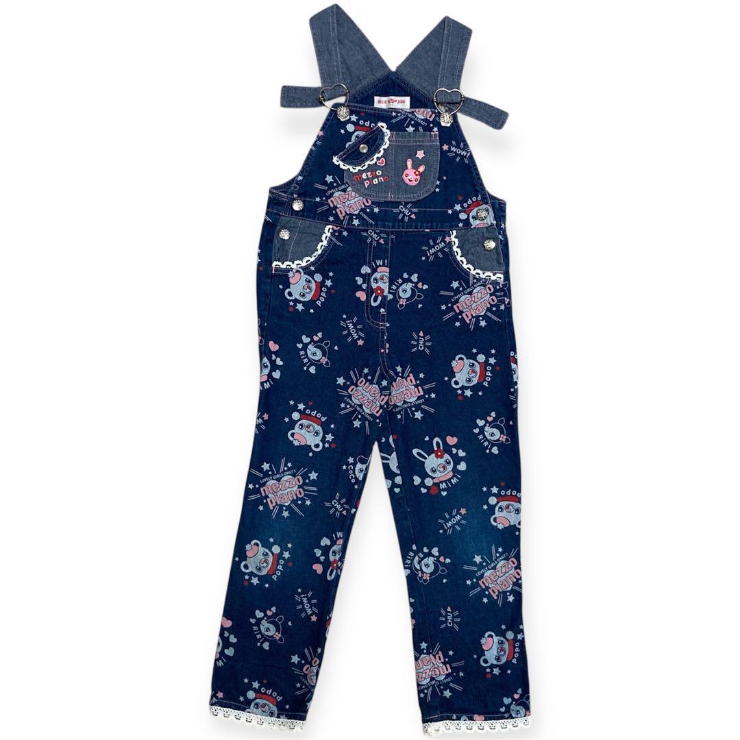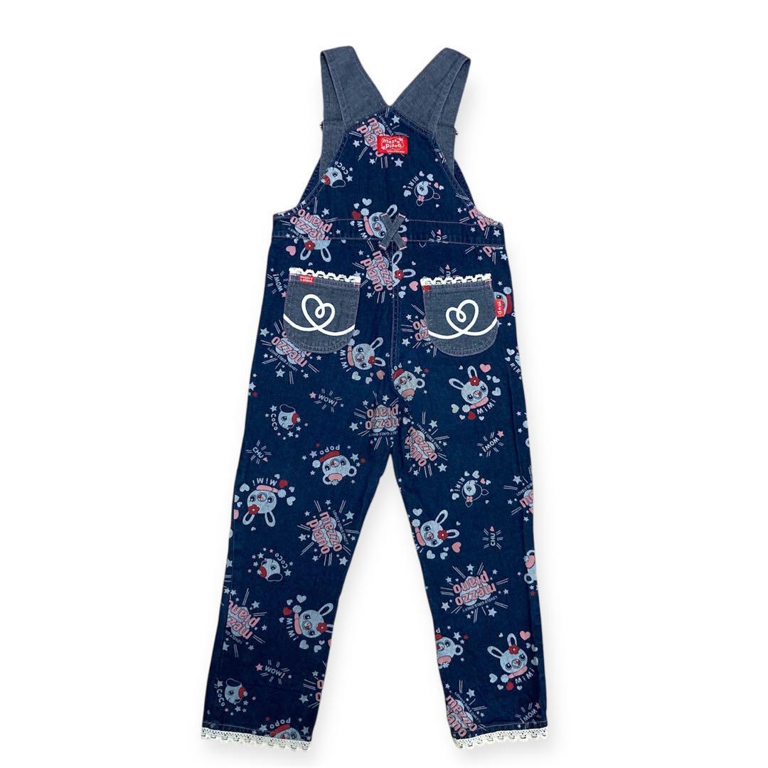昔のmezzo pianoのとても可愛いキャラクターのミミポポちゃん柄のオーバーオールです。総柄です。ボタンは薔薇が書いてあります。旧タグでレア物です。胸元にmezzo pianoのブランドロゴの刺繍があります。女の子用です。