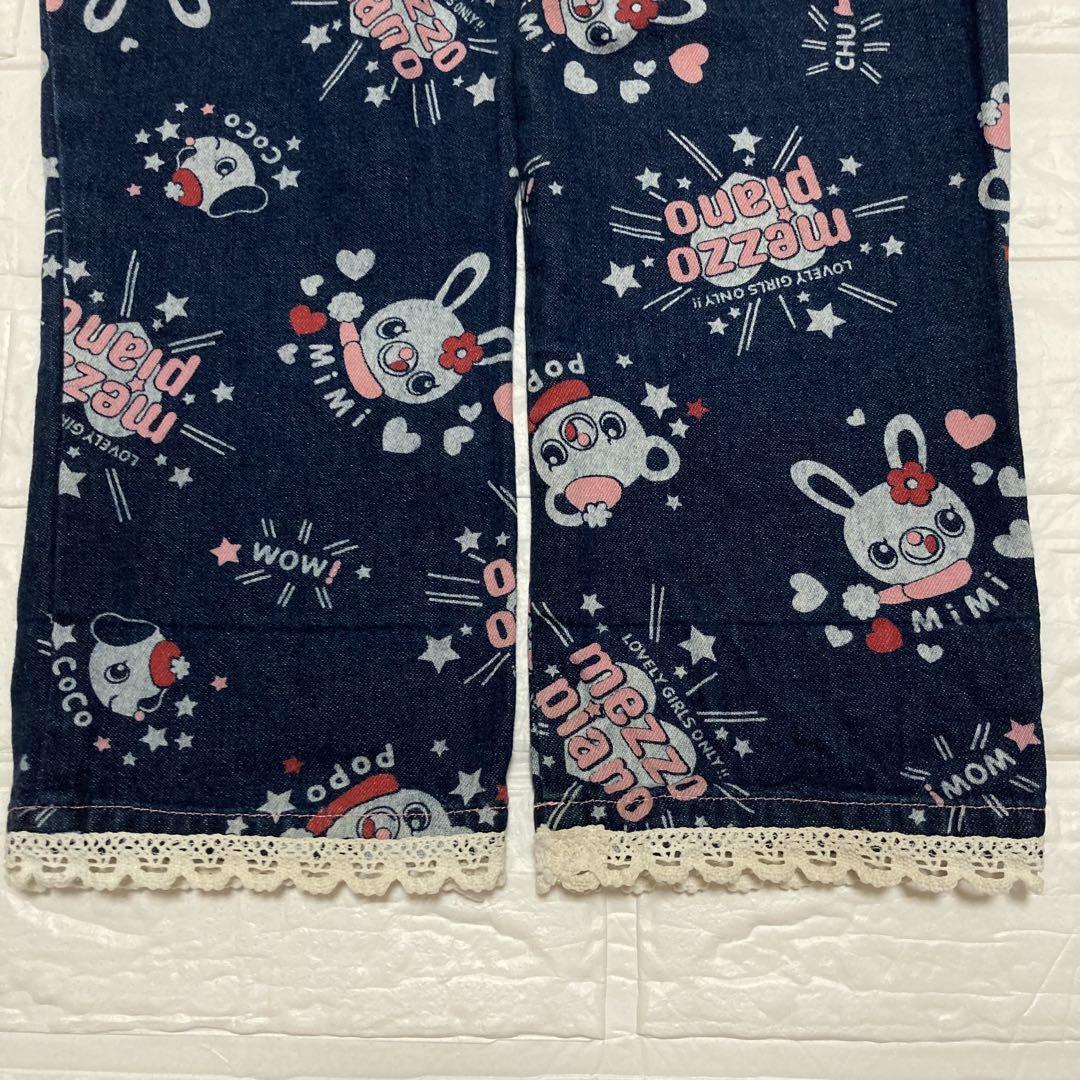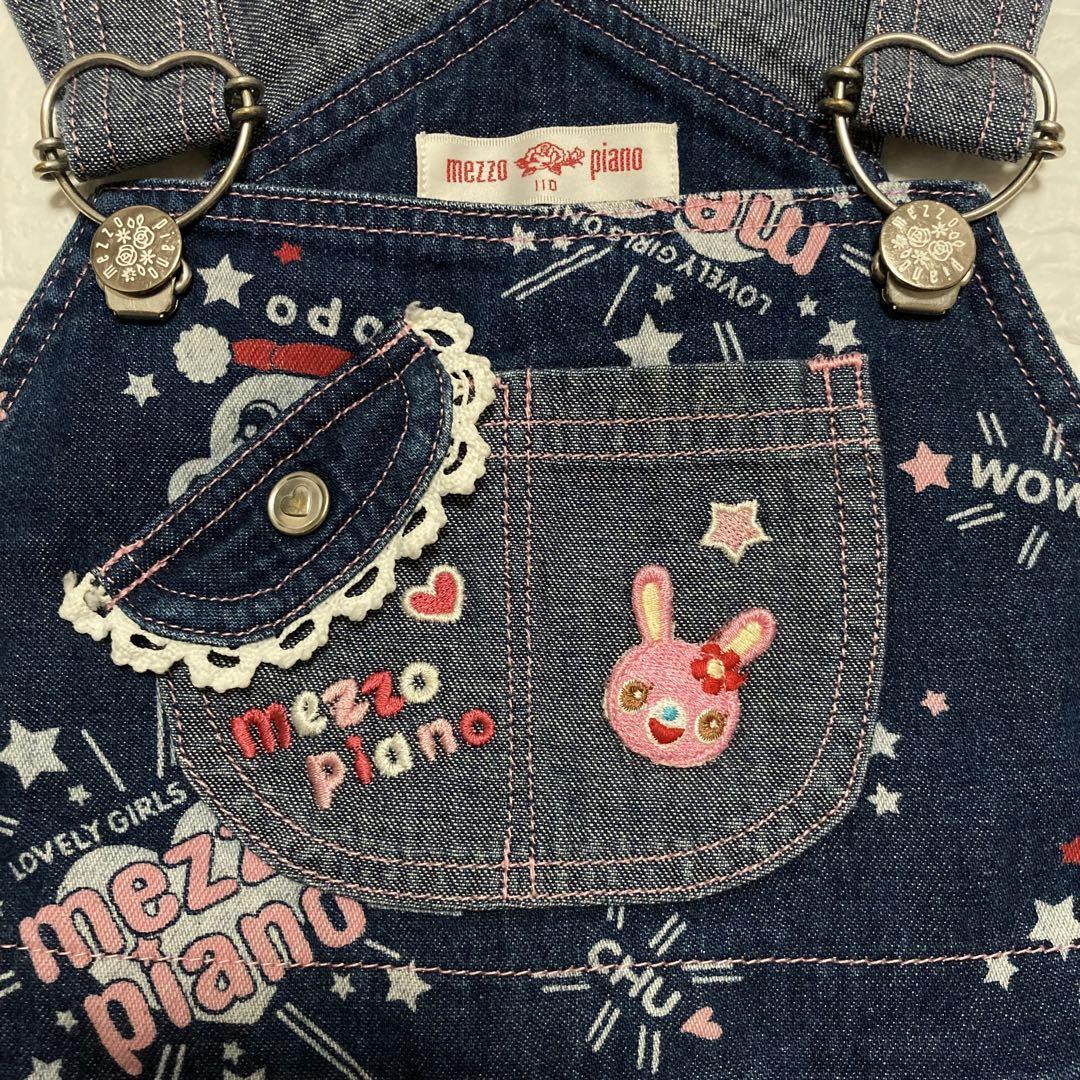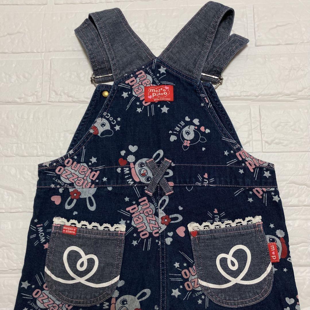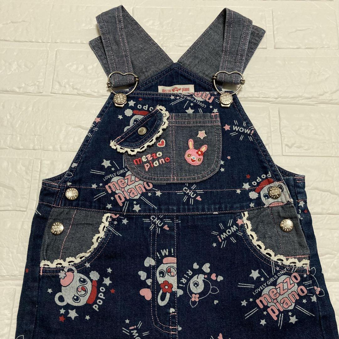 昔のmezzo pianoのとても可愛いキャラクターのミミポポちゃん柄のオーバーオールです。総柄です。ボタンは薔薇が書いてあります。旧タグでレア物です。胸元にmezzo pianoのブランドロゴの刺繍があります。女の子用です。