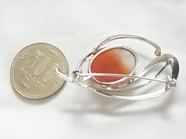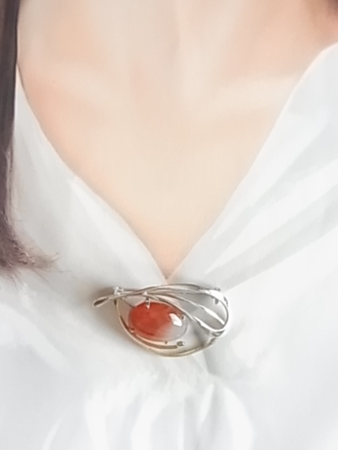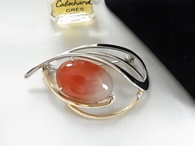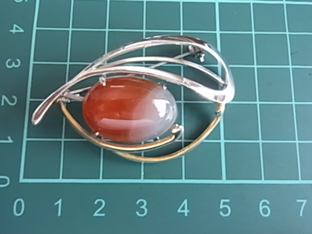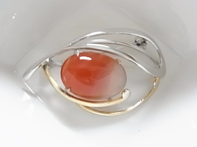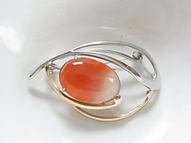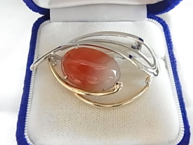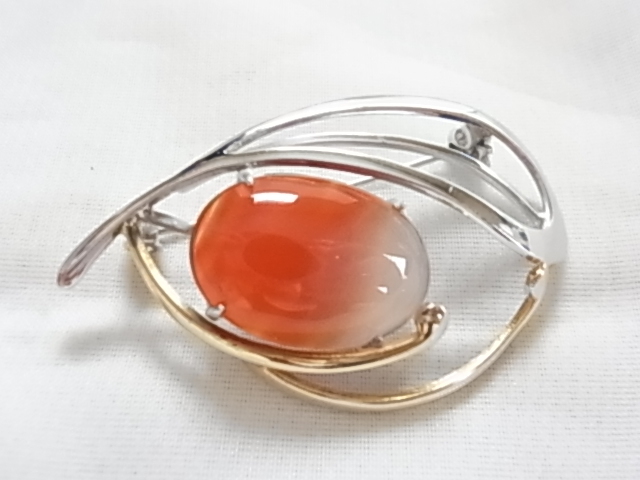 ビンテージ/ヴィンテージ カーネリアン 紅玉髄の楕円ストーン シルバートーンとゴールドトーン 和モダン 昭和レトロのブローチ★