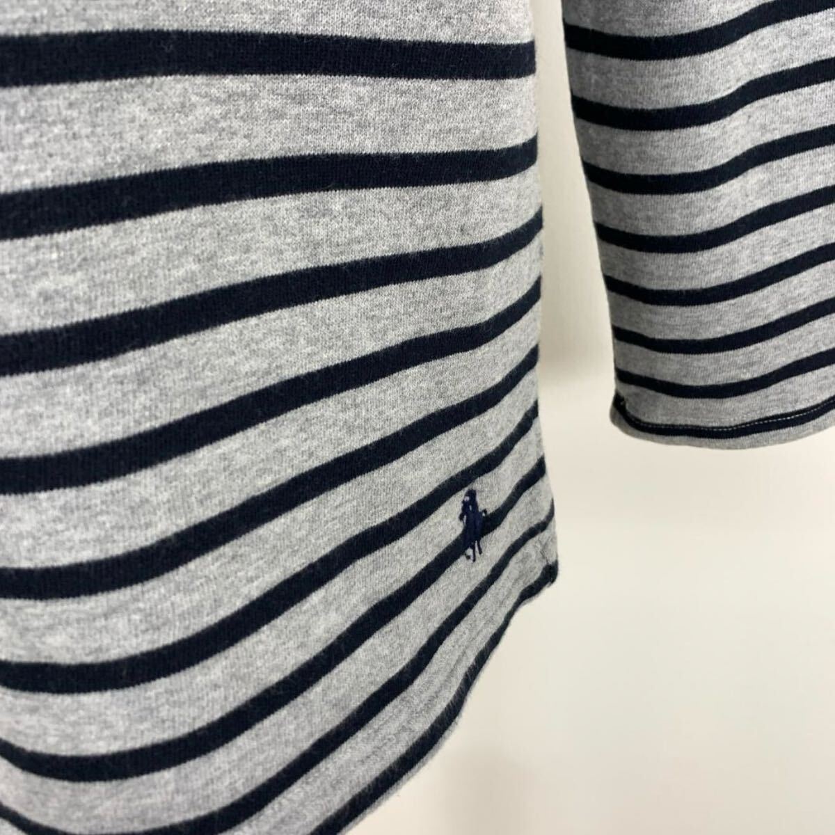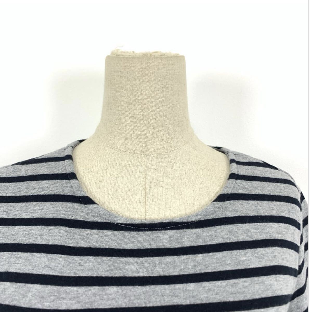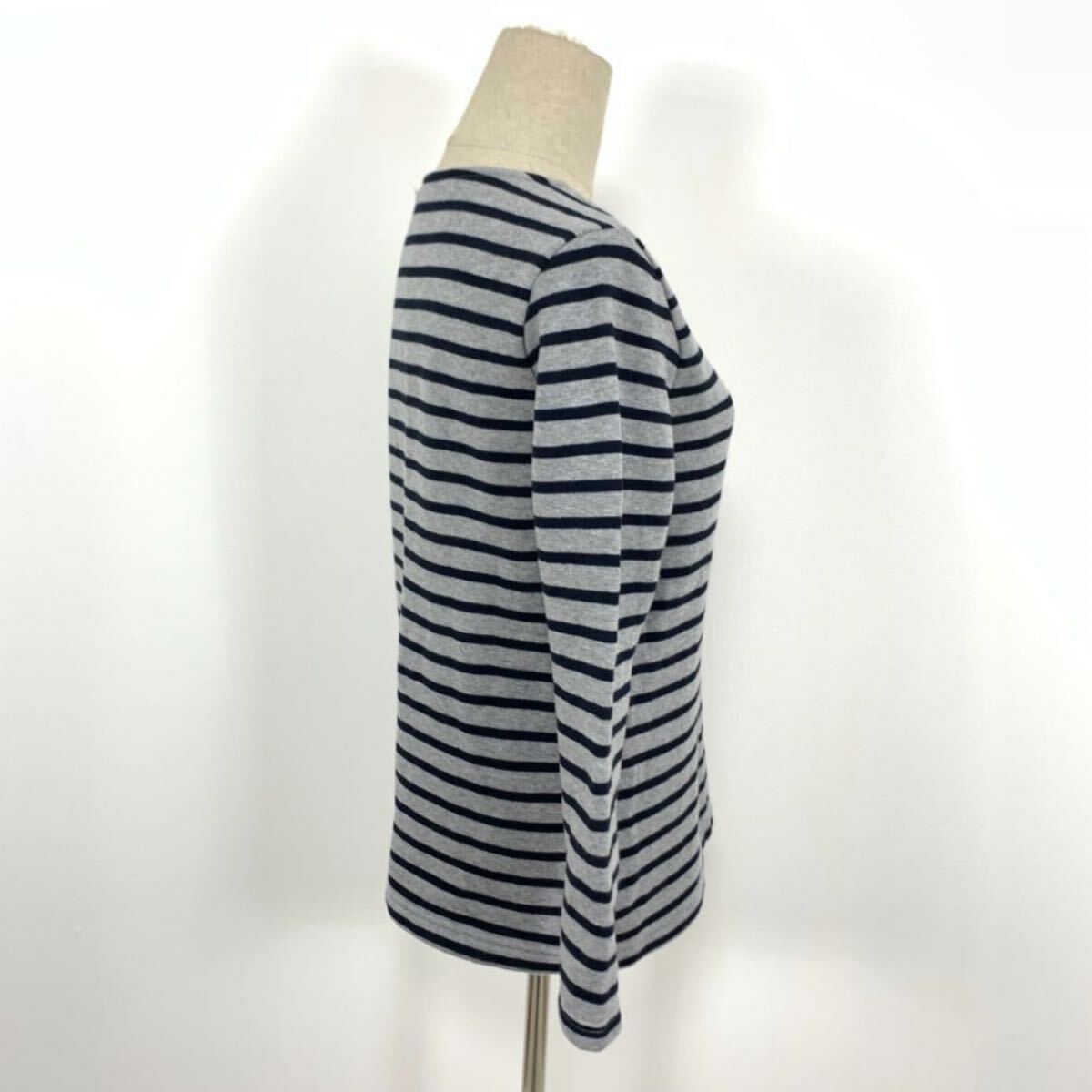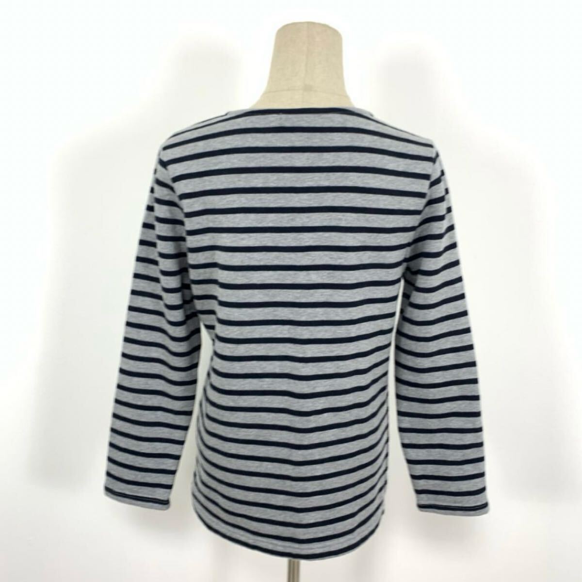 グレーとネイビーのボーダーデザインの長袖トップス。