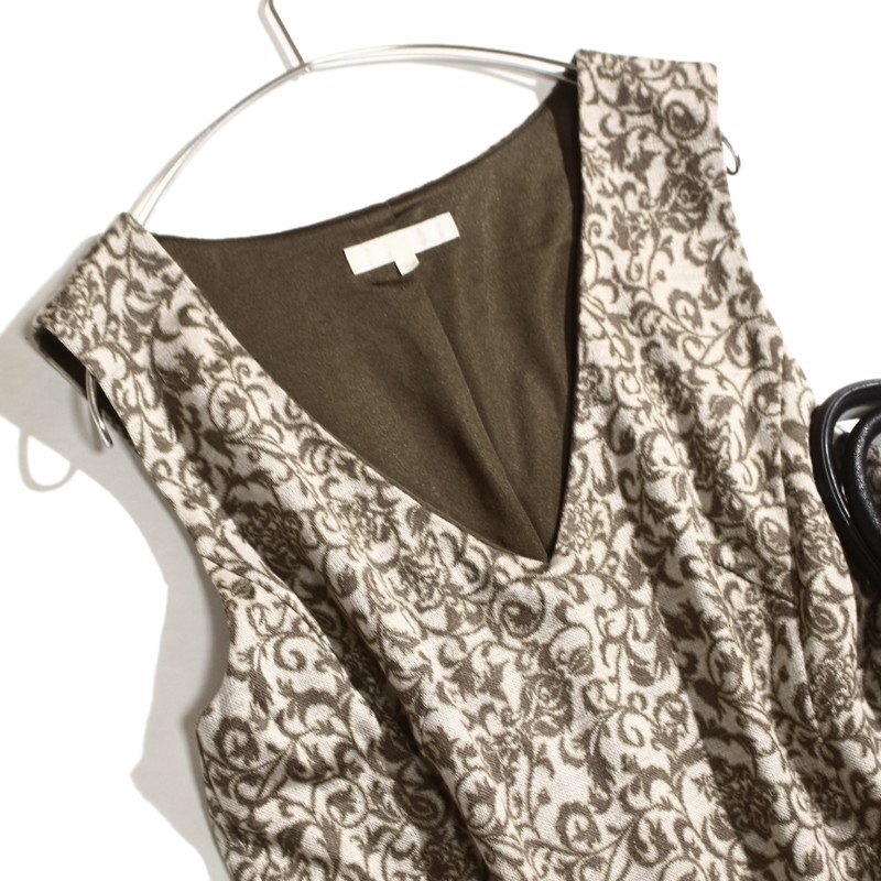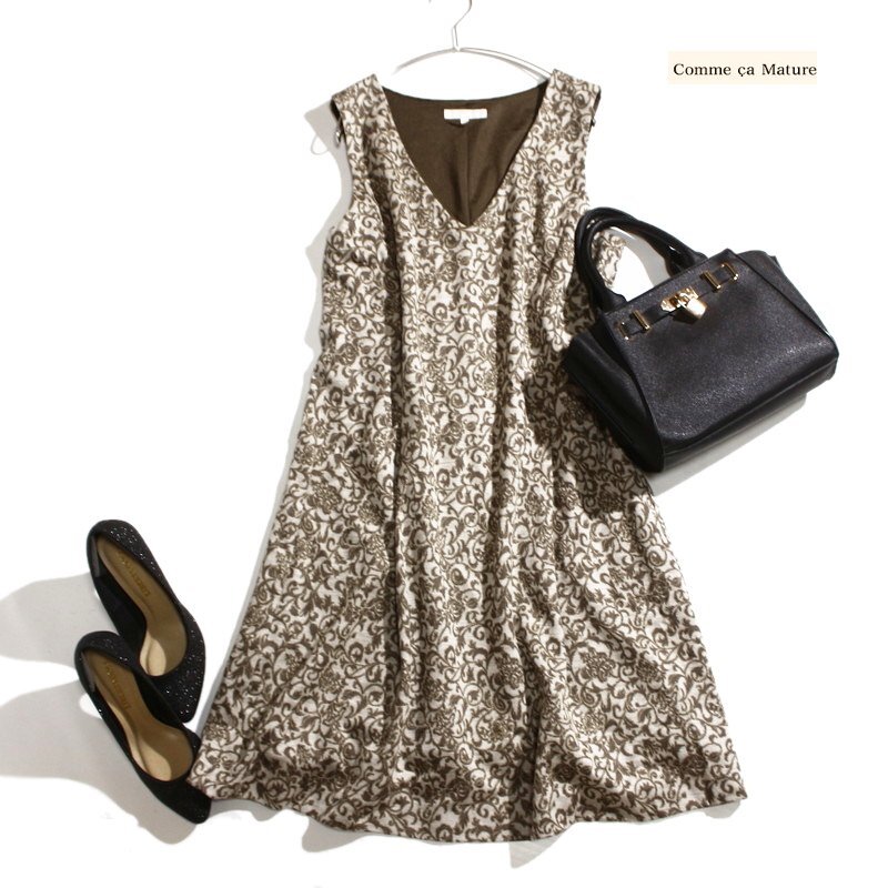美品 comme ca mature コムサ マチュア 秋 冬 アラベスク 柄 ジャガード ジャージ― ウールワンピース ノースリーブワンピース 9号 茶色