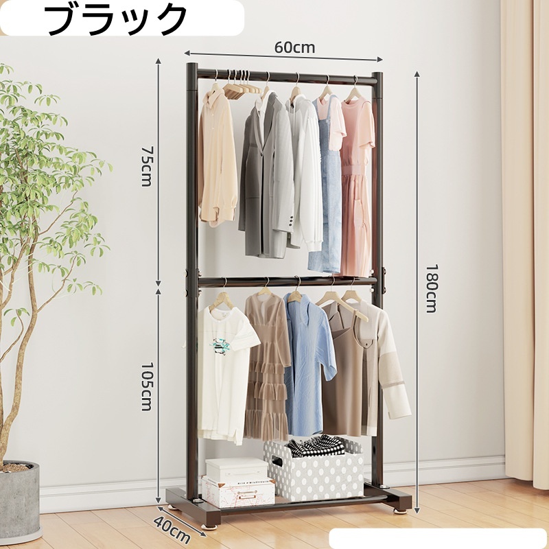 ■サイズ:奥行40cm×横60cm×高さ180cm■物干し部高さ・上段:75cm・下段:105cm■重量:約4kg■耐重量:約80kg■カラー:ブラック■材質:鉄※こちらの商品は、到着時ご自身で組み立てをお願いします。説明書付き。