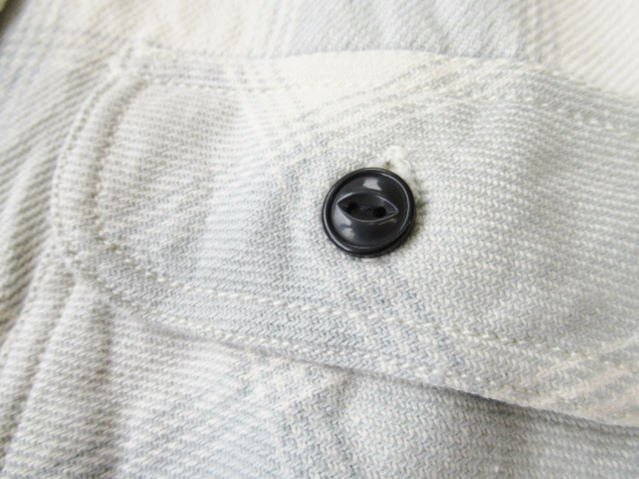 ビンテージ感漂うネコ目ボタンや、補強を兼ねた二重構造のエルボーパッチなどこだわりのディテール!