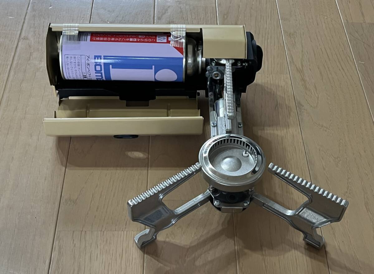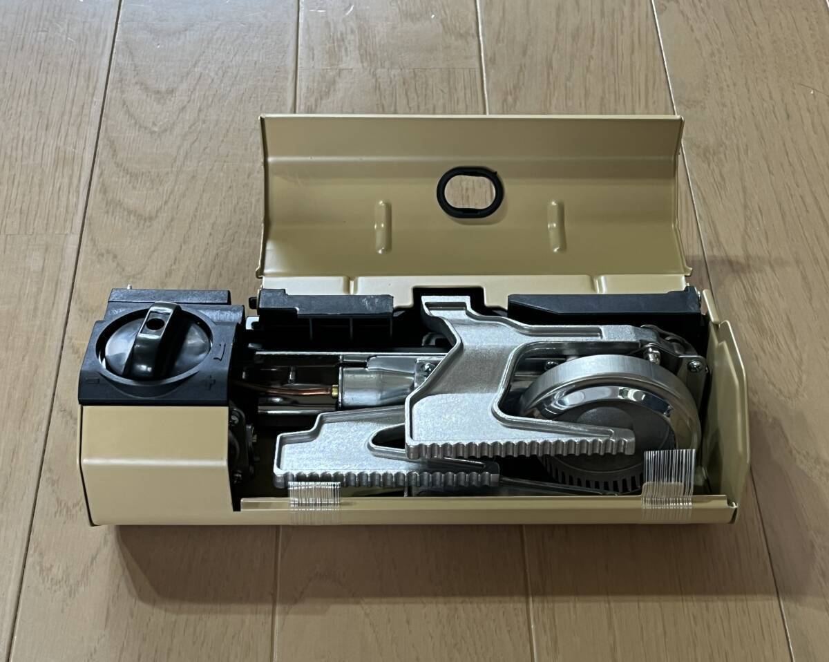 ガスボンベより少し大きい円筒状にコンパクトに収納できる凝った作りです。