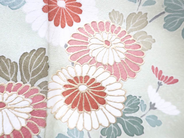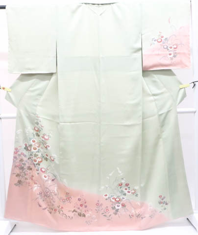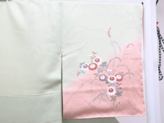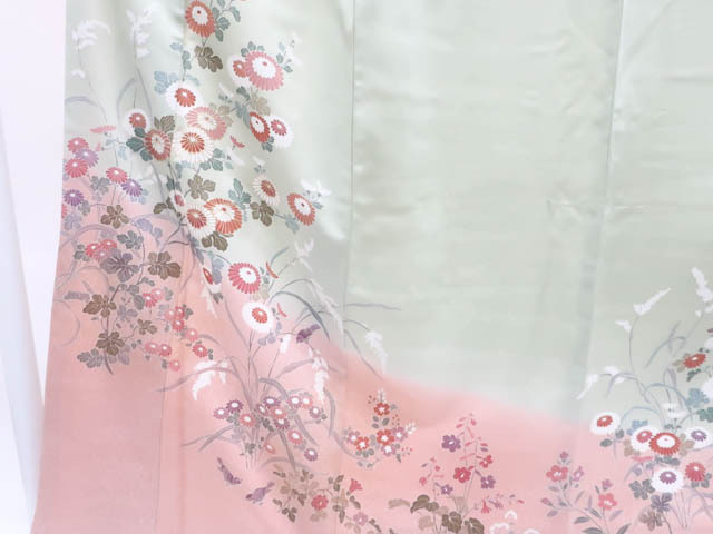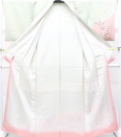 リサイクル商品のため、右衿、右前身頃の胴辺りにシミがございますが着用可能なお品です。 仕付け付きです。 地色は、白緑・ピンクです。 1枚目の画像が近いお色かと思われます。 素材は正絹です。 |