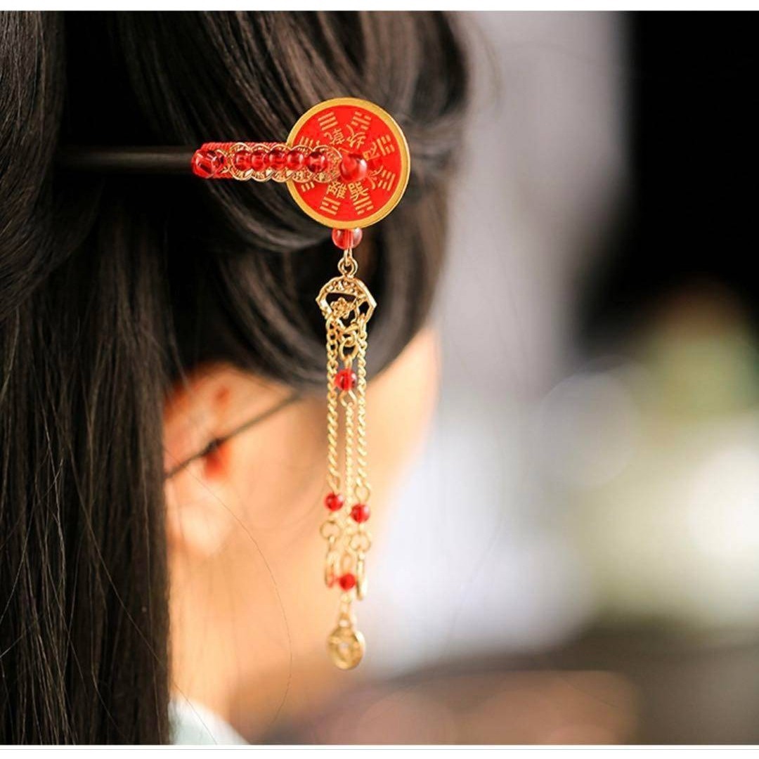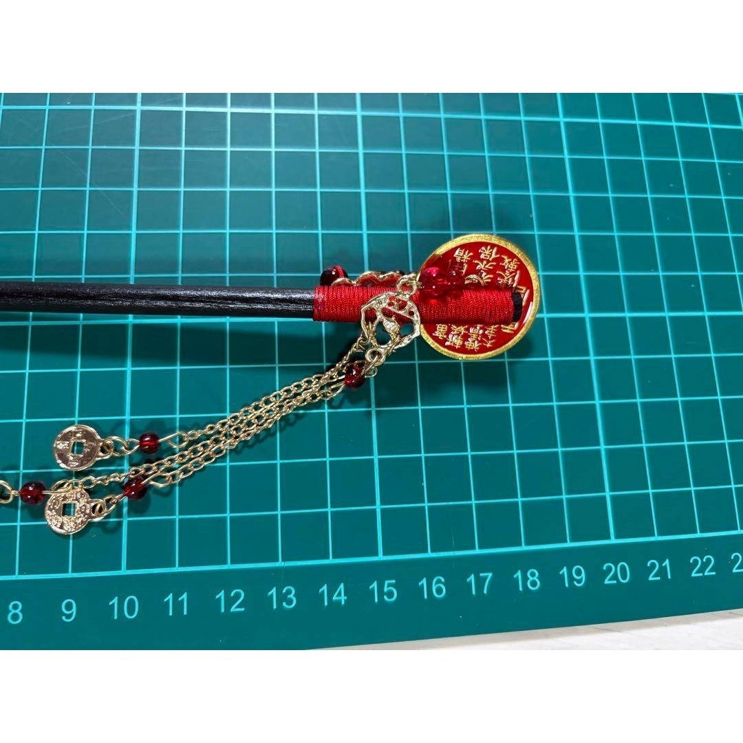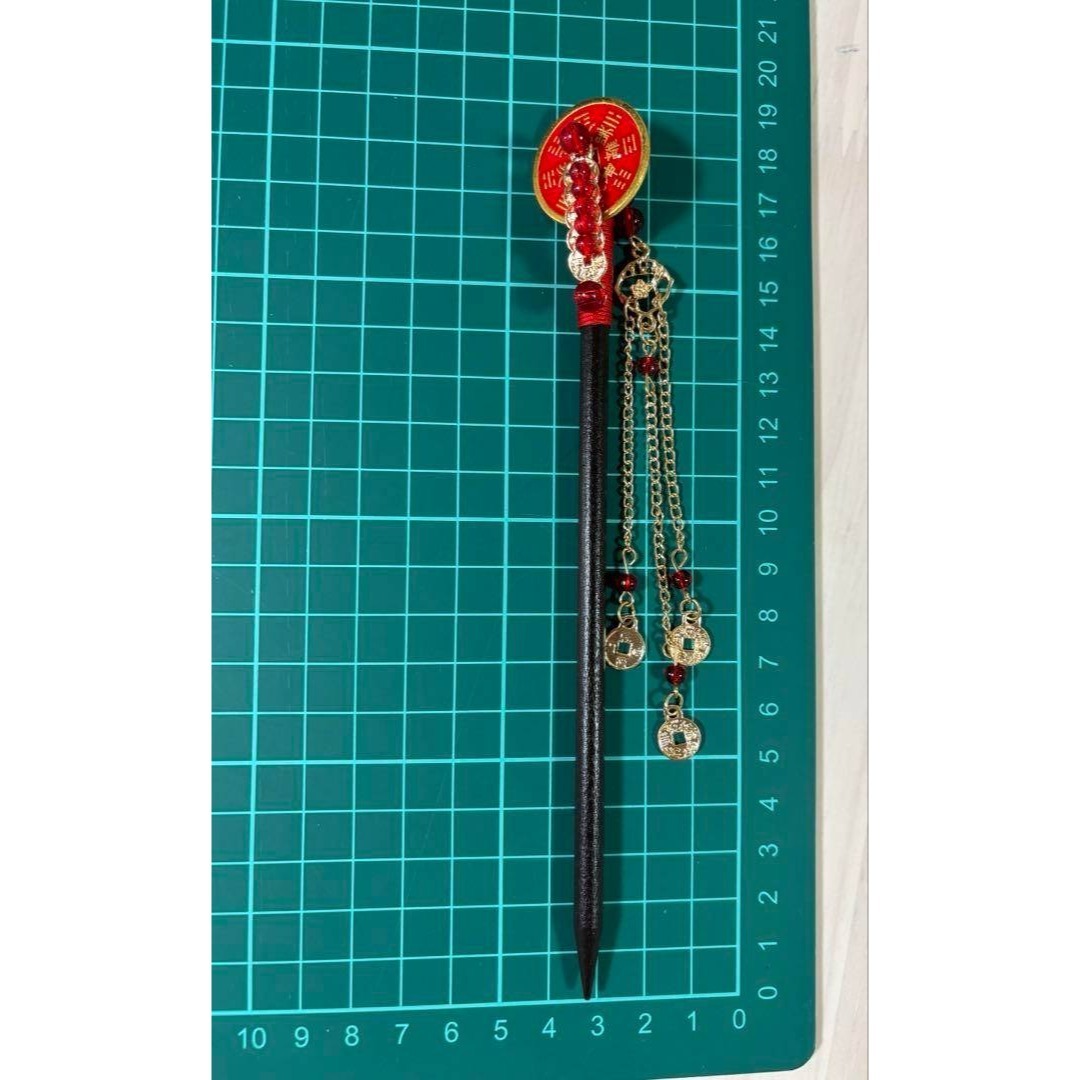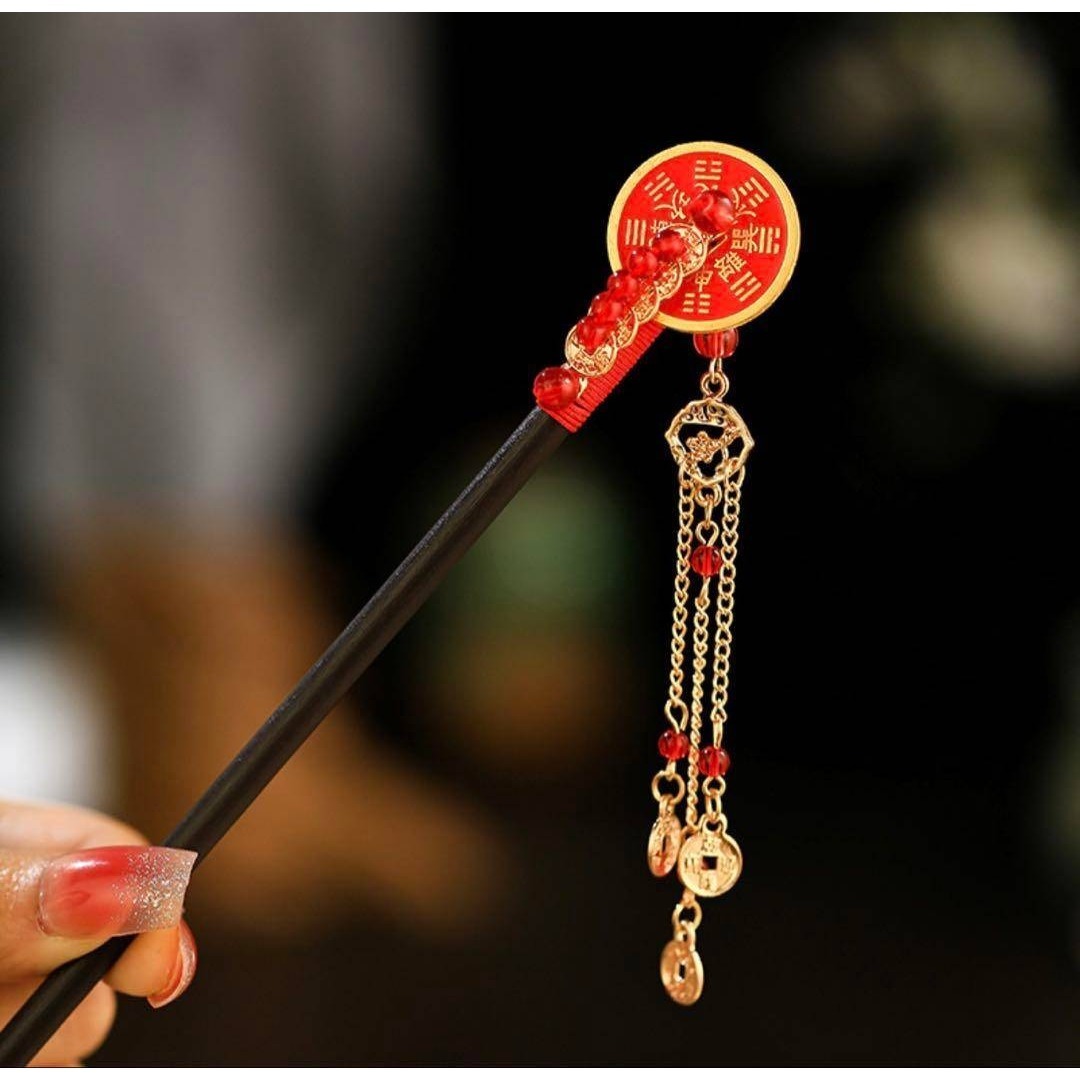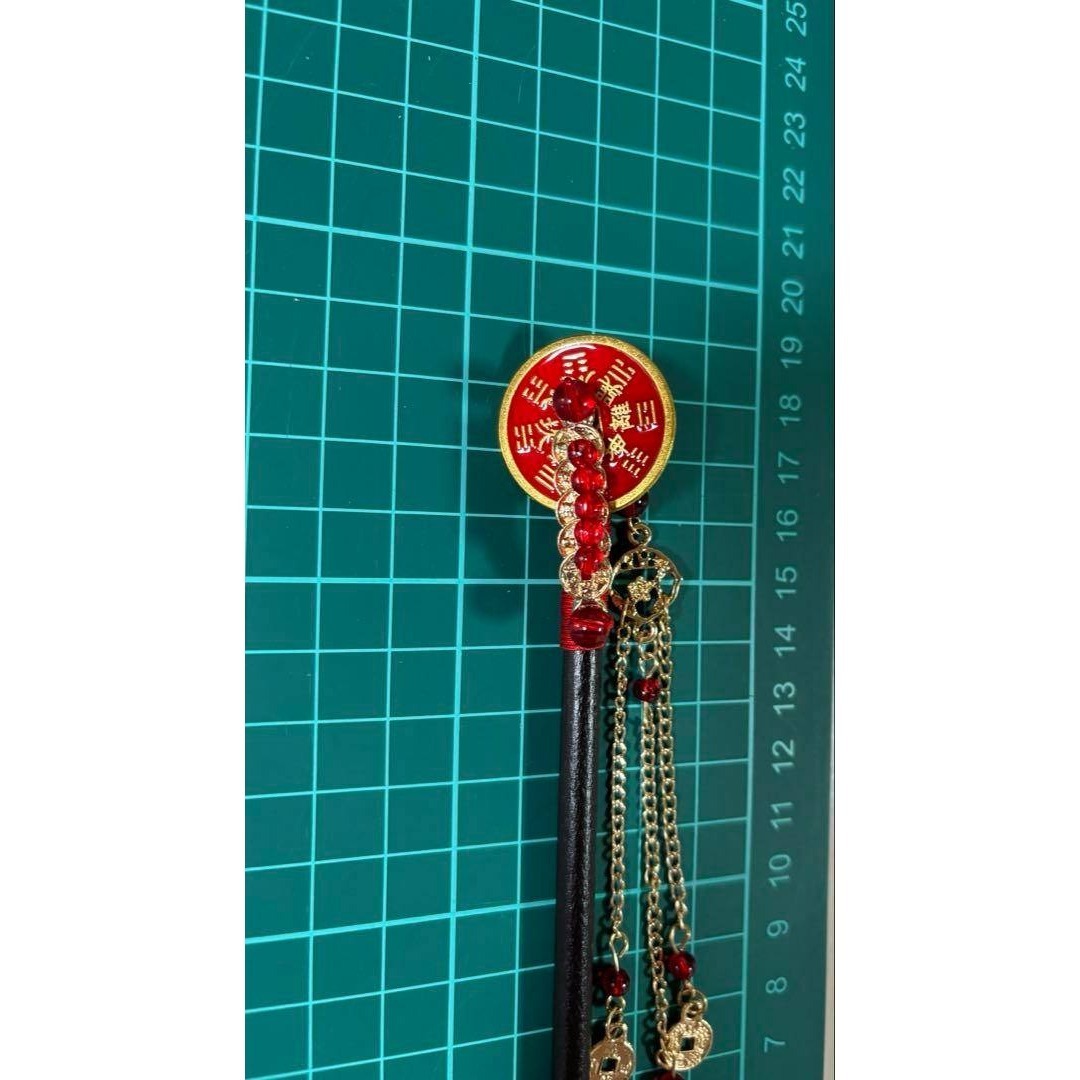 赤いラッキーカラーにゴールドの縁起模様をあしらった、美しい簪(かんざし)です。