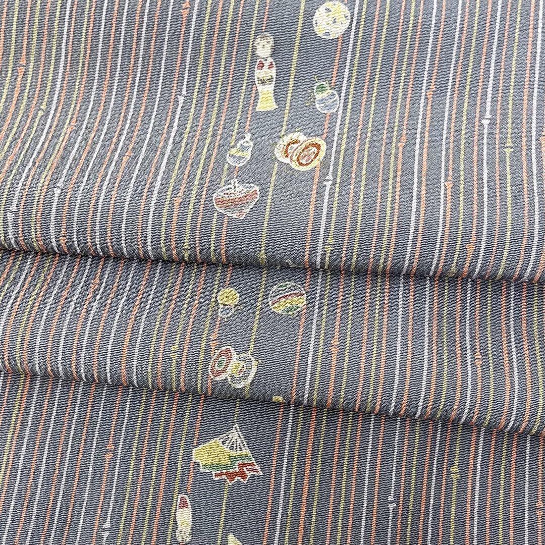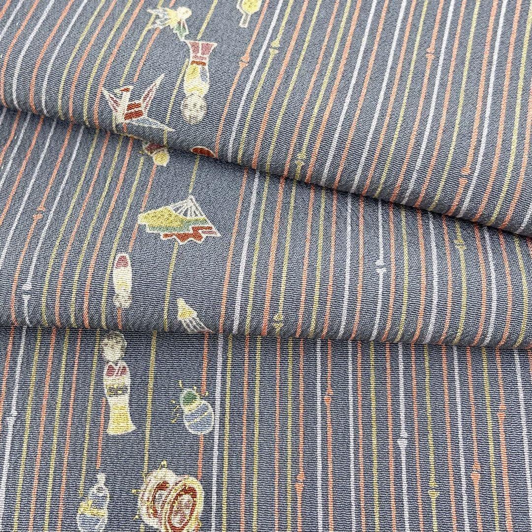 シックな色合いの地に、昔ながらのコケシや羽子板、
