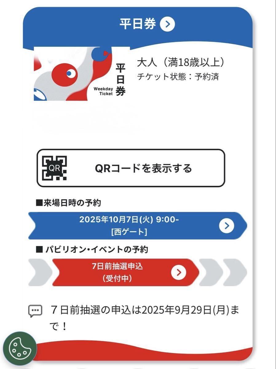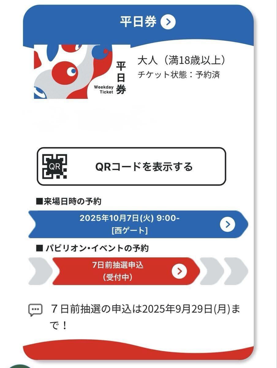 関西 大阪万博 EXPO 2025 入場チケット 大人2名 平日券 ペアチケット 10/7 10月7日(火) 西ゲート 9:00予約済み