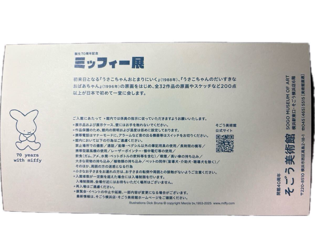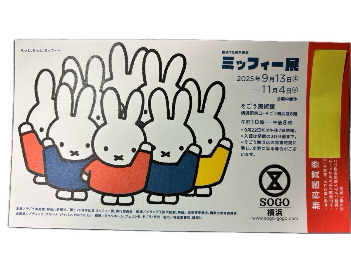 2025年9月13日から11月4日まで『そごう美術館』(そごう横浜店6階)で開催されている『誕生70周年記念 ミッフィー展』の無料鑑賞券1枚です。