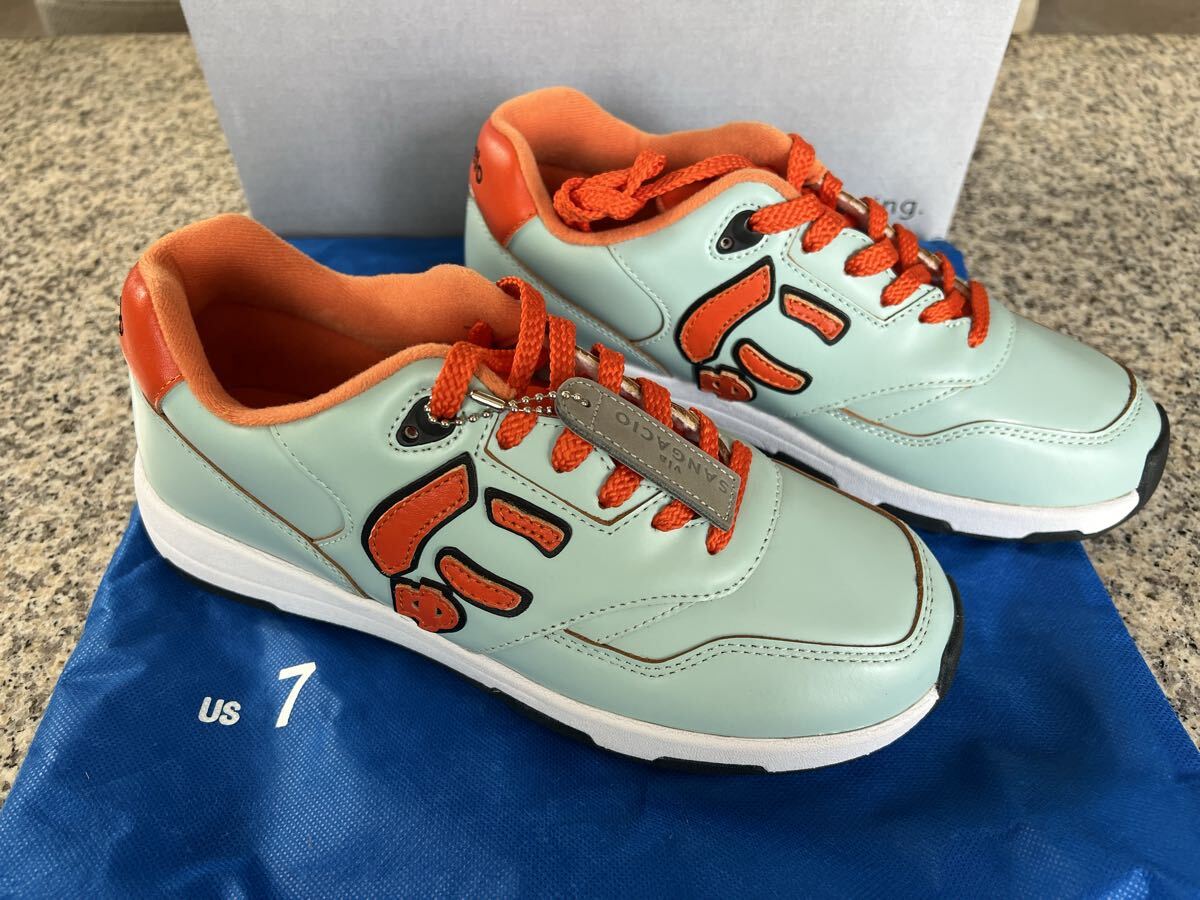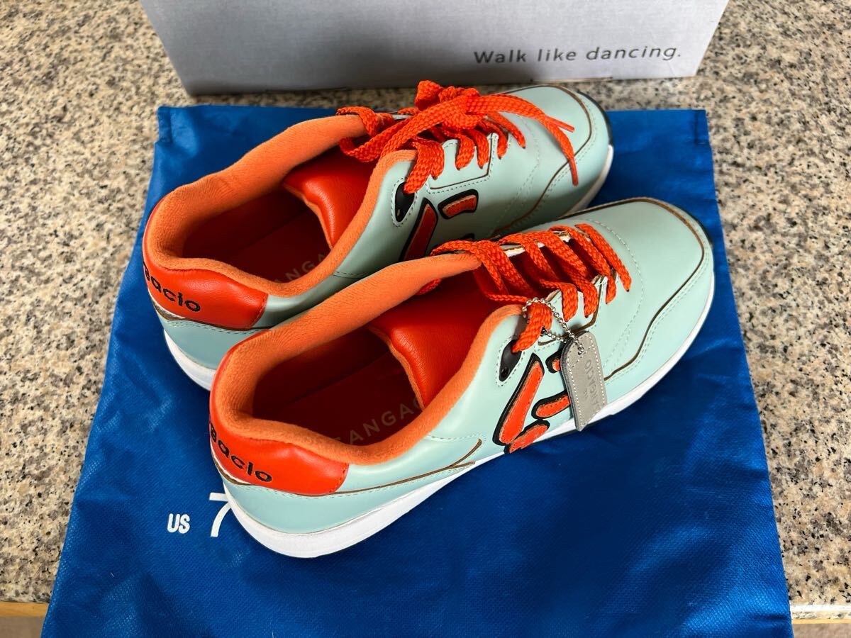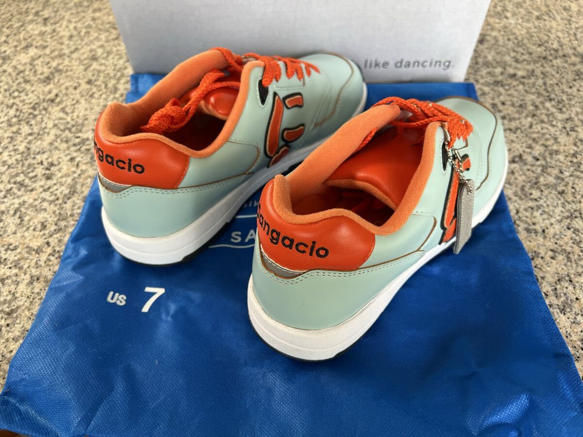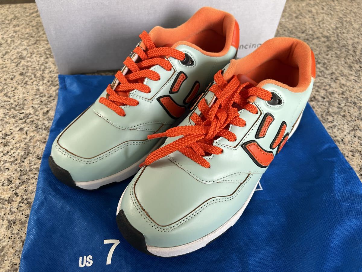 ミントグリーンとオレンジの配色が特徴的なスニーカー。