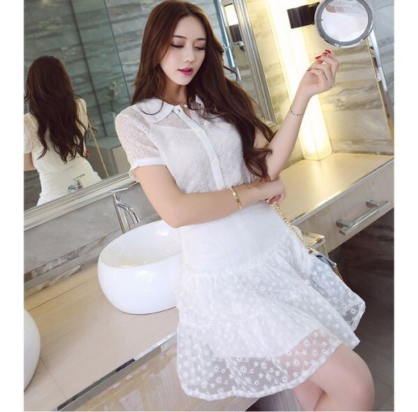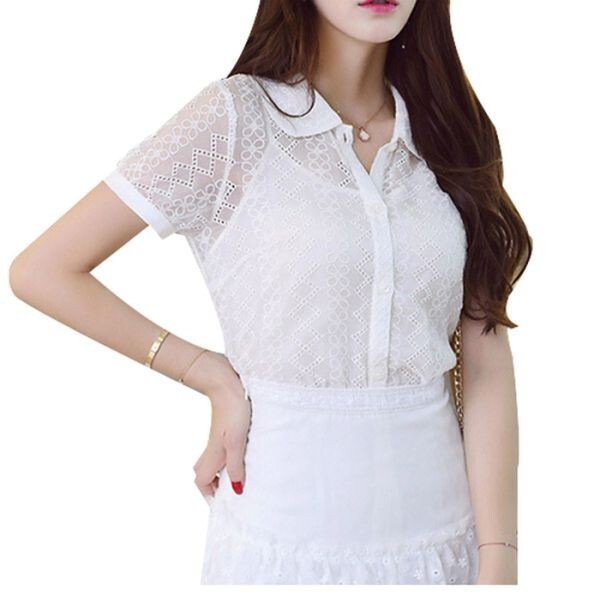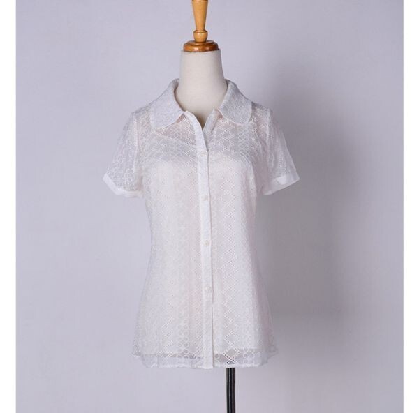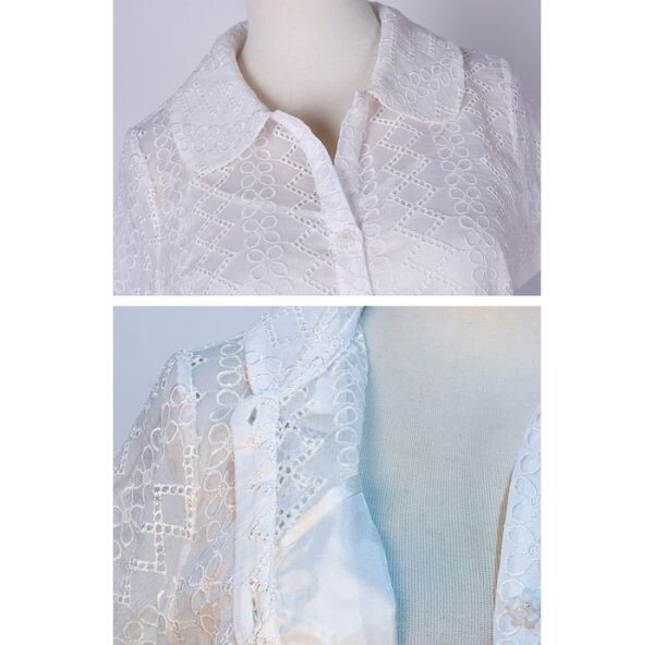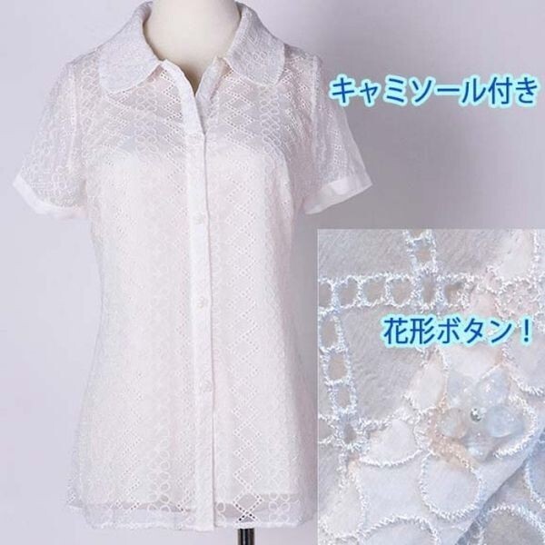 紺碧色 女性 T ホワイトTシャツ トップス 透け感 レース ボタン 花柄 刺 半袖Tシャツ キャミソール付き シャツ ホワイトT- ホワイトシャツ 白いT