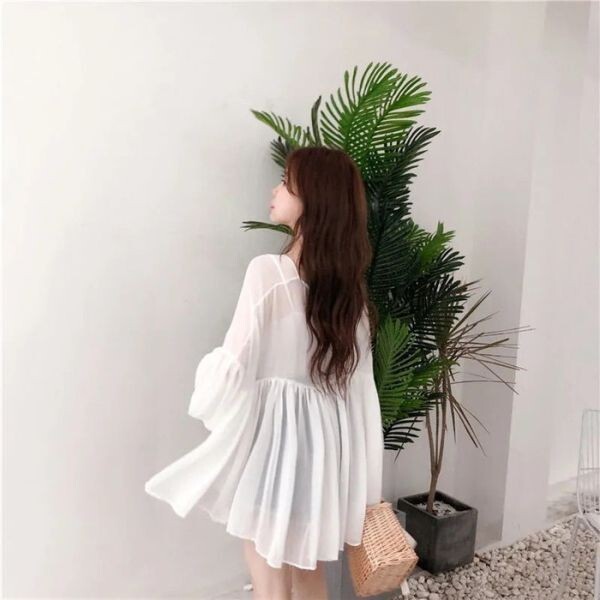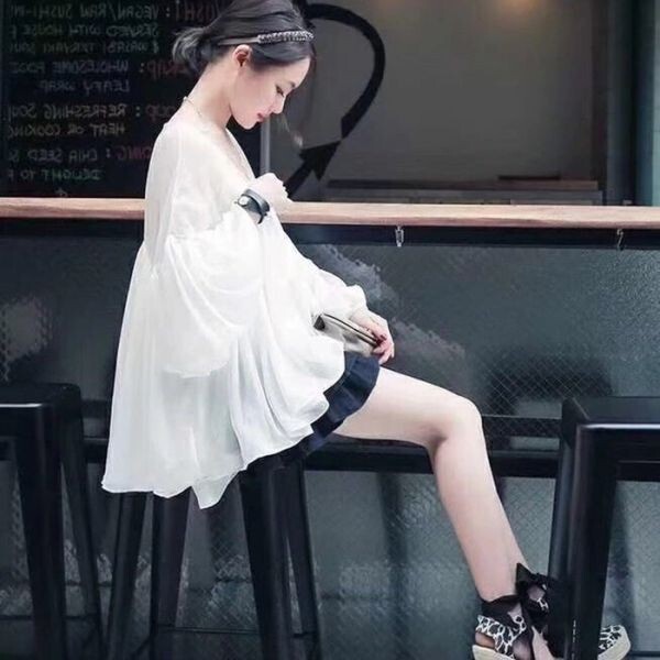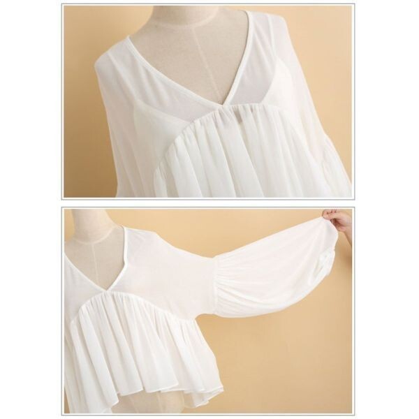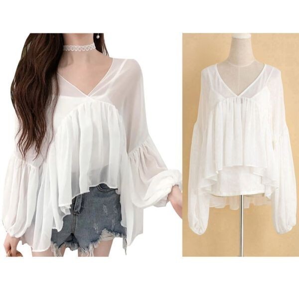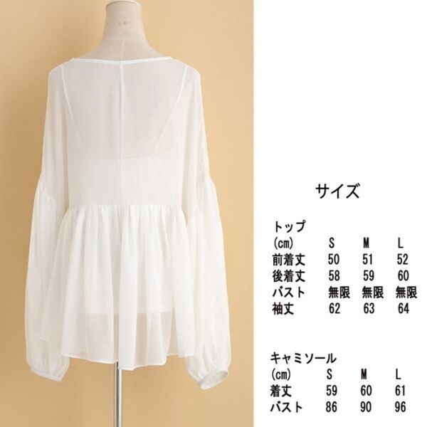 シフォンチュニック フレア袖 半袖 二の腕カバー 透け フレア ドレープ 着痩せ 半袖 キャミソール付き ロングスリーブ ビーチ 白 ホワイトシフォンチュニックキャミソール付き、袖の長さを自由に調整できます。