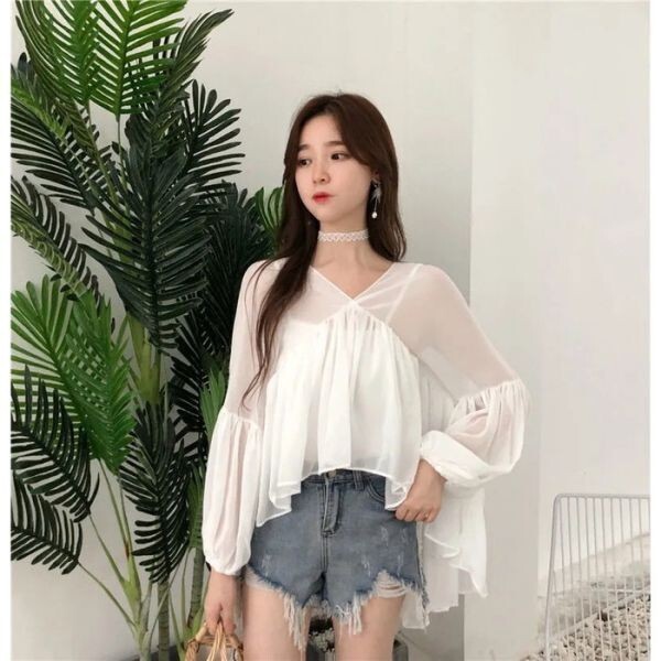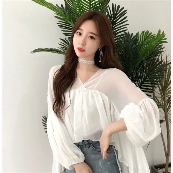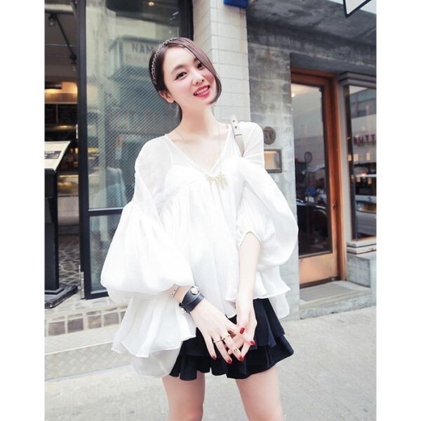 Vネックフレアシフォントップス。ボリューム感たっぷりだけどシフォン素材で軽く着れるトップスです。Vネック鎖骨魅せ&長さ調整可能な袖と裾の広がりが体型カバーもしてくれるのでうれしい!スキニーでもショーパンでも何にでも合わせやすくコーディネートは自由自在です!