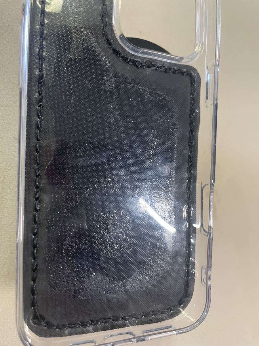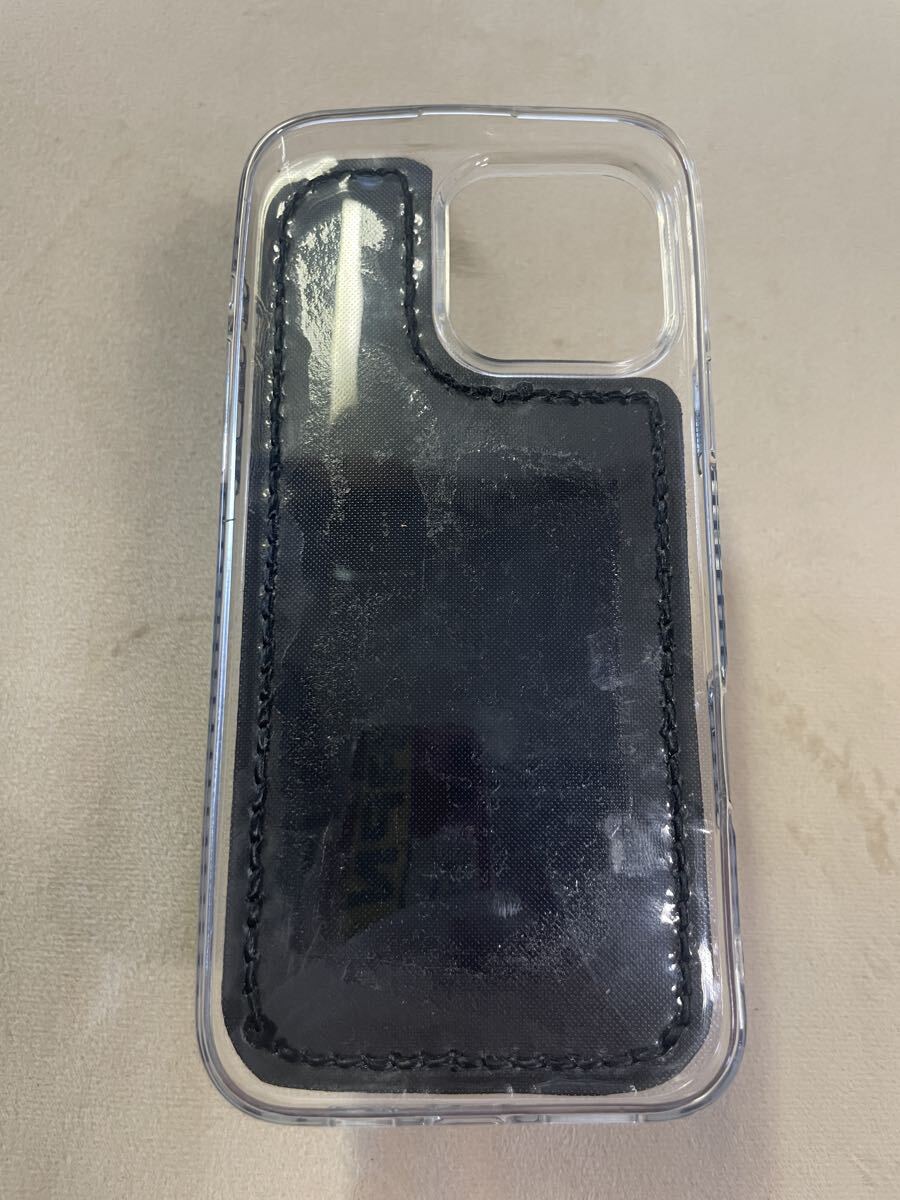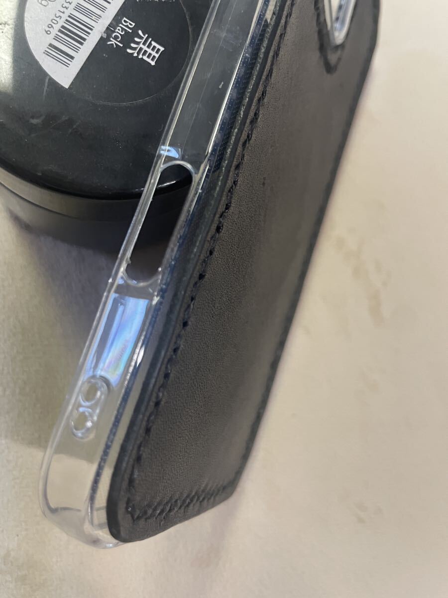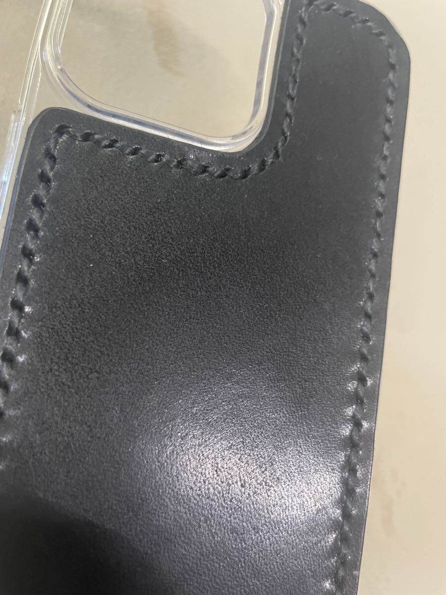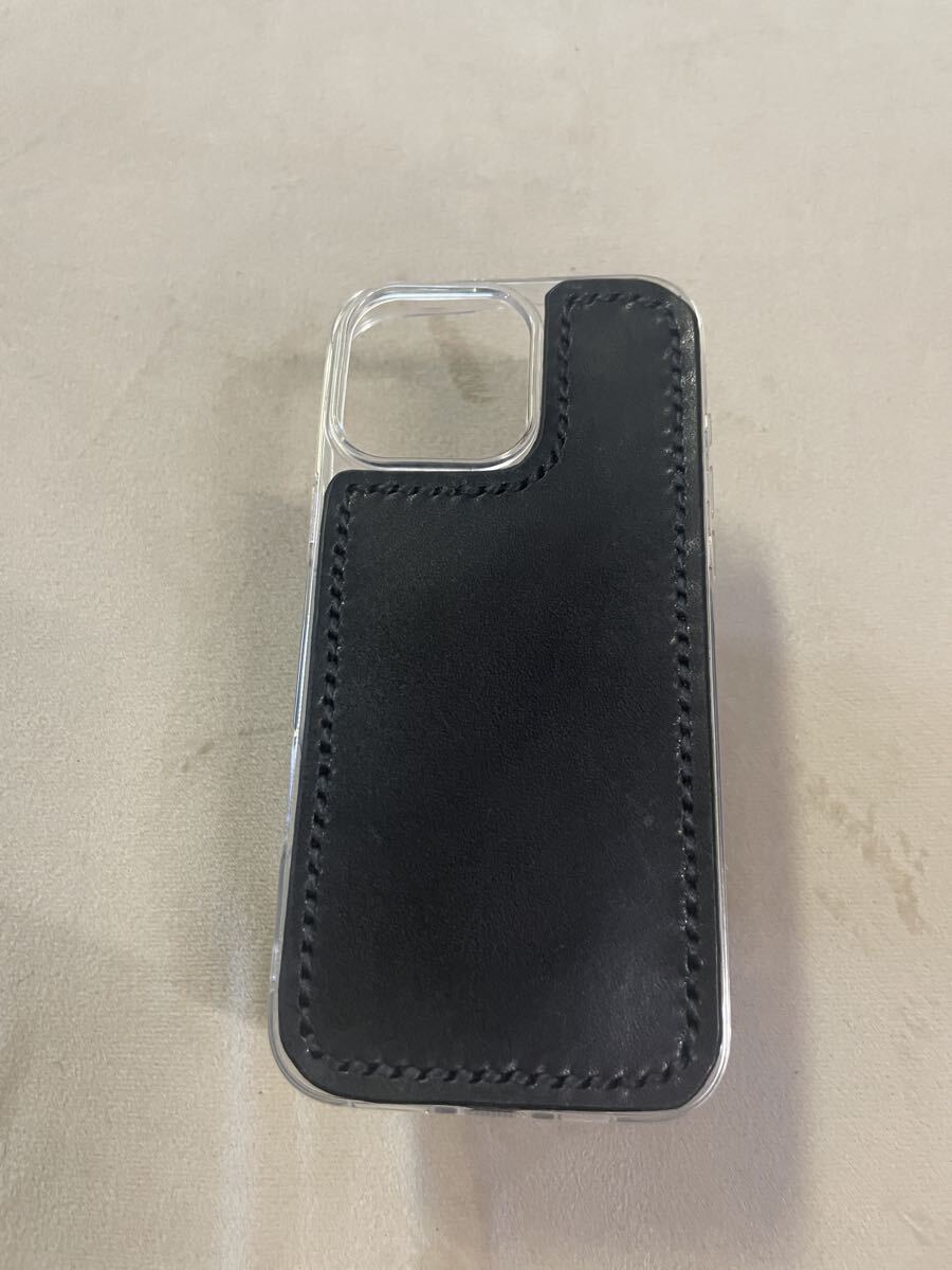 国産タンニンなめし牛革とダイソー製ソフトケースを張り合わせ、黒シニュー糸で手縫いで縫い合わせてます。