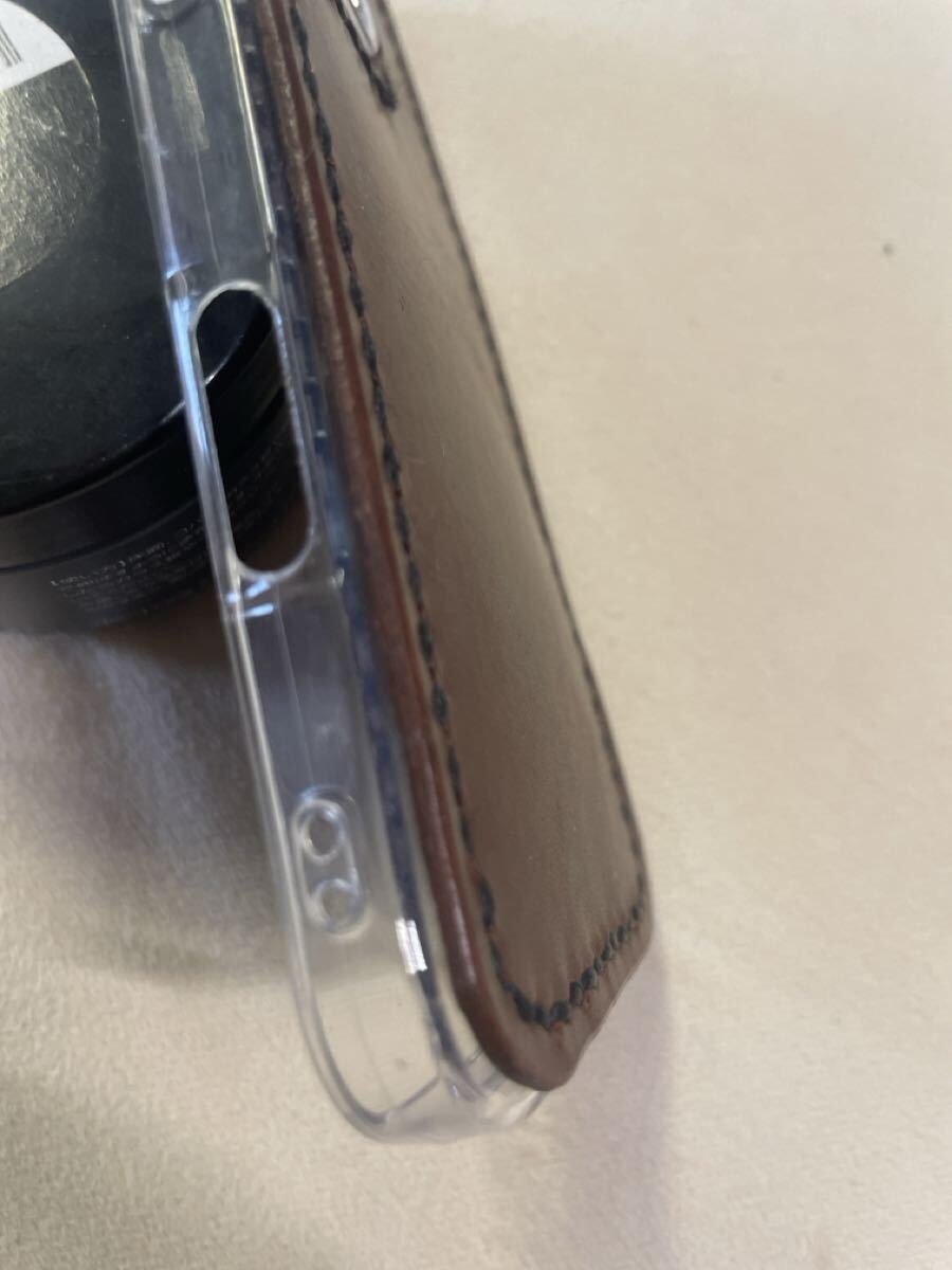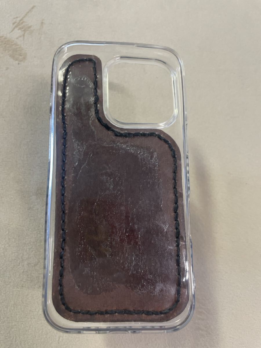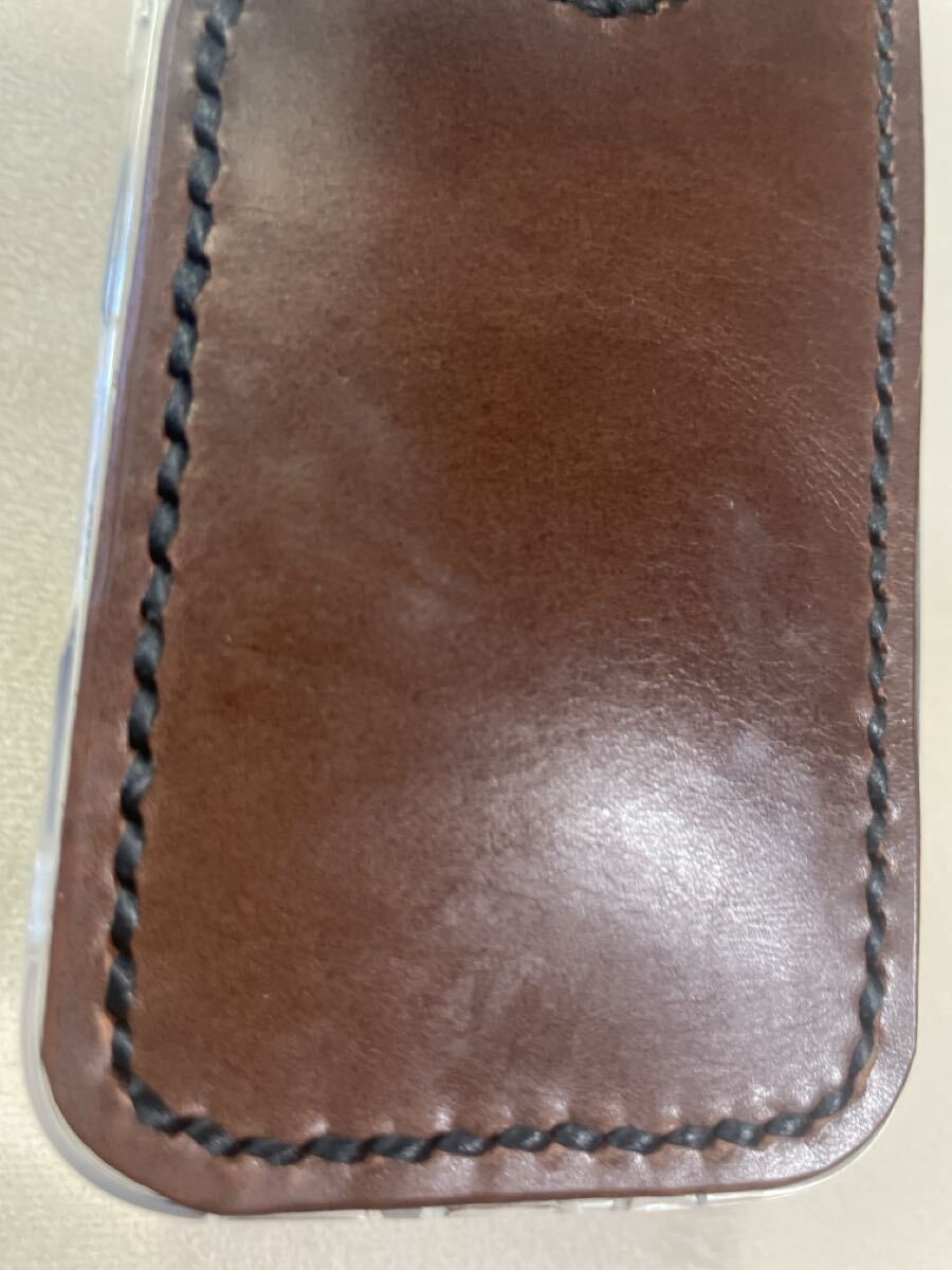 国産タンニンなめし牛革とダイソー製ソフトケースを張り合わせ、黒シニュー糸で手縫いで縫い合わせてます。