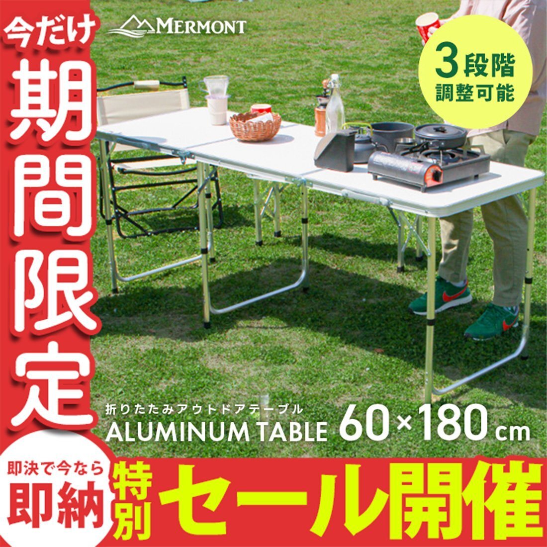 | 商品情報 かんたん組立の折りたたみアウトドアテーブル(6~8人用)です。 コンパクトサイズの180cm×60cm!! サビに強いアルミを使用! 天板には防水加工が施されています。 必要のない時は折りたたんで収納できる!! 取っ手付きで持ち運びもラクラク♪ 高さは「ハイスタイル」「ミドルスタイル」「ロースタイル」の3段階調節。 付属の脚ジョイントを使用する場合はハイスタイルとして、 脚ジョイントを使用しない場合はロースタイルとして、 使用することができます。 お好みや用途に合わせて使い分けることができる嬉しい仕様♪ キャンプ、バーベキュー、お花見などにとても便利! 【商品仕様】 カラー:ホワイト サイズ:(約)幅180×奥行60×高さ55/62/70cm 収納サイズ:(約)60×60×6.5cm 重量:(約)7.2kg 耐荷重:(約)20kg 【注意事項】 海外製品で簡易梱包での輸入の為風防に擦れや多少の小キズなどがある場合がございますが、商品自体には問題ありませんのでご了承下さい。 (アルミ 折り畳み 折りたたみテーブル アウトドアテーブル バーベキュー BBQ) |