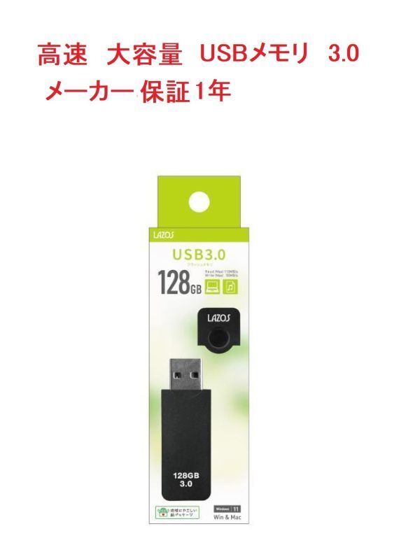 1年保証 USBメモリ usbフラッシュメモリ usb3.0 128gb 高速 容量 おすすめ 小型 メモリースティック Lazos製 BK