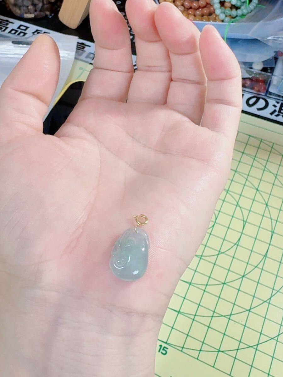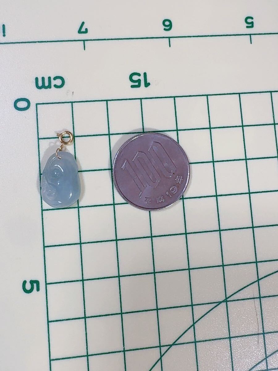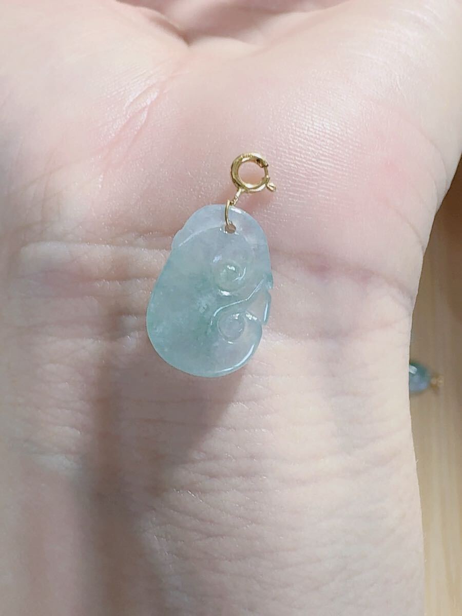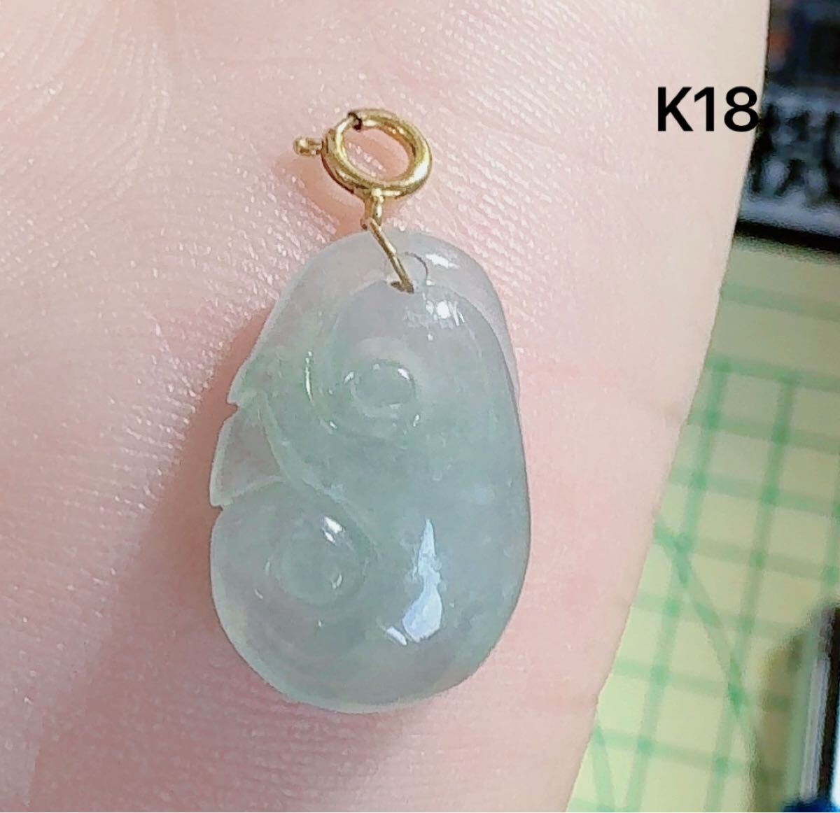 R2-02200-1天然本翡翠《本物保証》 高氷種淡緑色翡翠 「如意」ミニペンダント トップK18 一点物 希少 縁起物 お守り パワーストーン