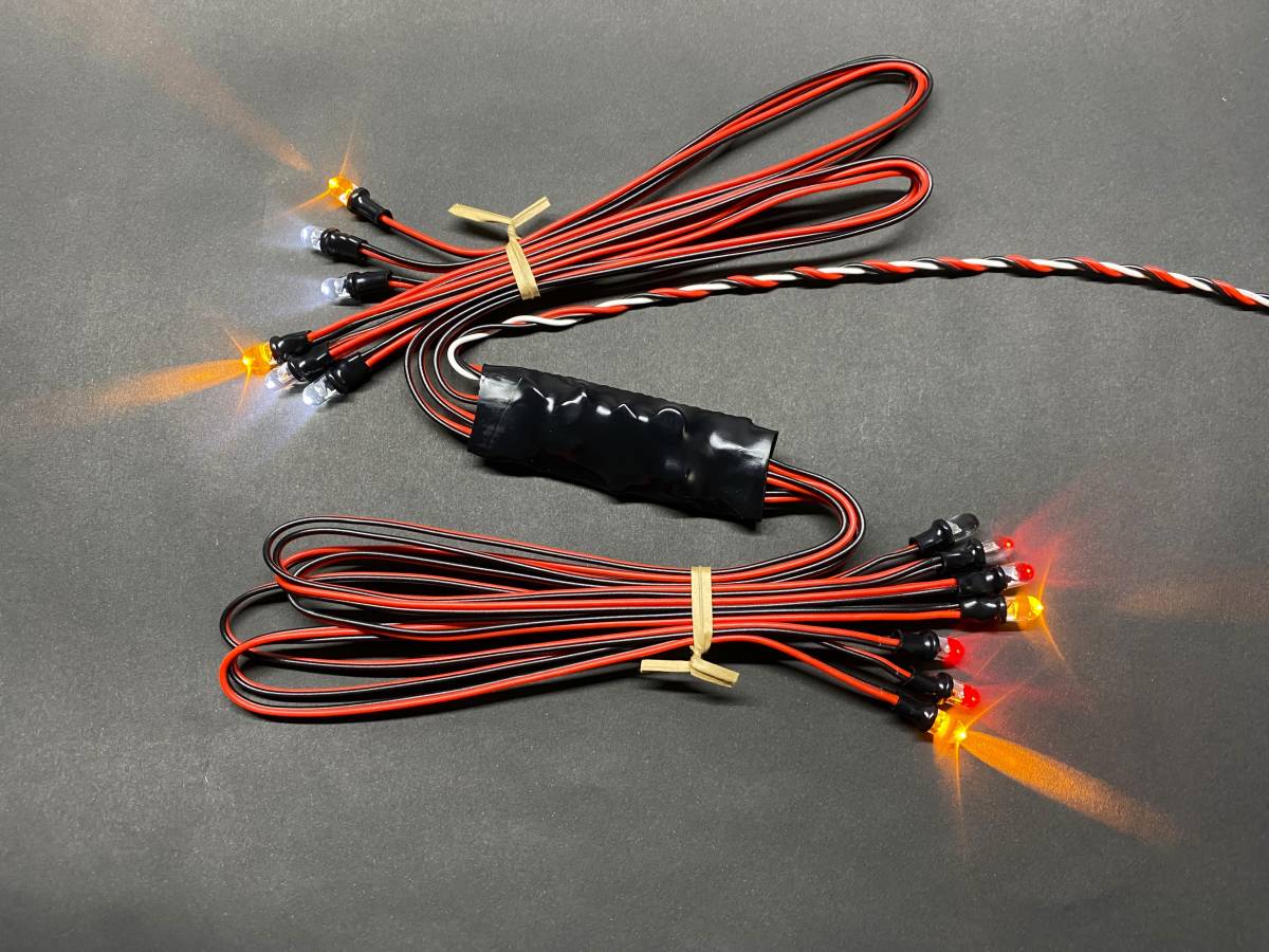 ・フロントライト白色4灯・黄色2灯、リアライト赤色4灯・黄色2灯、リアマフラー黄色1灯、全て5mm径LEDで計13灯。