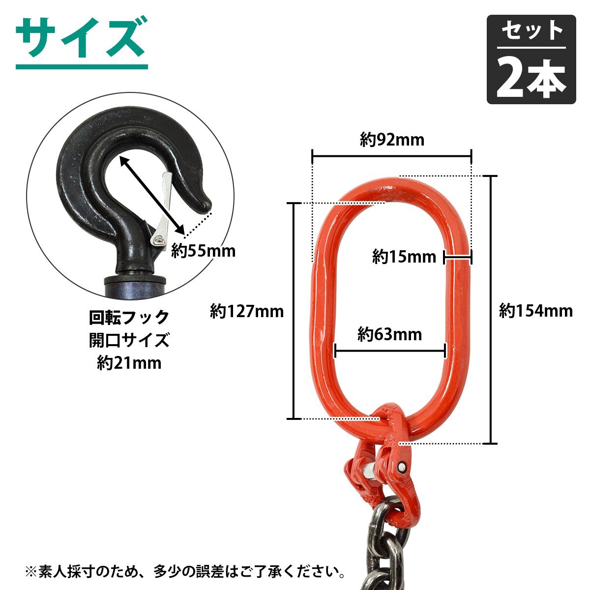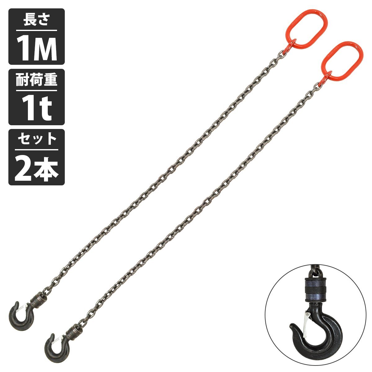 【送料無料】[ 2本セット 1t 1M ]1本吊り チェーンスリング 吊り スリング チェーン 回転フックタイプ リンツ付き 径6mm 長さ 1m 耐荷重