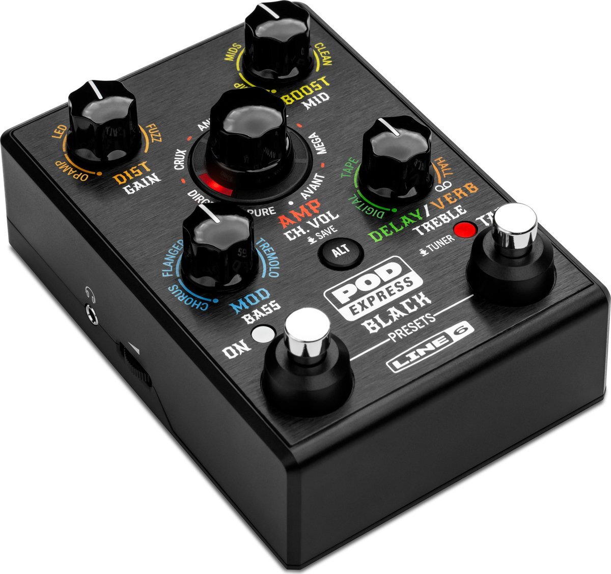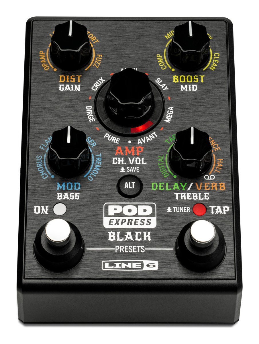 ハイゲインを素早く手元に POD(R)Express Blackは、クラシックでモダンなハイゲイン・トーンを求めるギタリストに、アンプとエフェクトが搭載されたコンパクトで簡単に持ち運びができるツールボックスを提供します。ユーザーフレンドリーなインターフェイスが直感的なサウンド・メイキングを可能にし、そのサウンドはLine 6のフラッグシップ製品であるHelixから継承されています。電池駆動とヘッドフォン出力により、どこでもプレイすることできます。2基のフットスイッチ(タップ/チューナー)、1/4”ステレオ出力、4イン/4アウトUSBオーディオ・インターフェース機能を備えたPOD Express Blackは、持ち運びからデスクトップまで幅広い用途に対応し、ステージ上でのライブでも活躍することでしょう。 LEDリング 7つのセグメントに分割されたマルチカラーLEDが点灯し、さまざまなパラメーター機能のステータスを確認できます。AMPエンコーダーを回すと、赤色のLEDでどのアンプ・モデルを選択中かが分かります。ALTボタンを押しながらAMPエンコーダーを回すと、LEDセグメントが対応する値を示します。エフェクト・ノブを回すと、LEDセグメント(1~7)が現在選択中のエフェクトのレベルを示します。 LEDリングAMPエンコーダーエフェクト・ノブALTボタンONフットスイッチ&LED TAPフットスイッチ&LEDプリセット・モード・スイッチ Back view of POD Express Guitar pedal IN ここにギターを接続します。電池を使用する場合、ケーブルをここに接続するとPOD Expressの電源がオンになり、ケーブルを抜くと電源がオフになります。 LEDリング:7つのセグメントに分割されたマルチカラーLEDが点灯し、さまざまなパラメーター機能のステータスを確認できます。AMPエンコーダーを回すと、赤色のLEDでどのアンプ・モデルを選択中かが分かります。ALTボタンを押しながらAMPエンコーダーを回すと、LEDセグメントが対応する値を示します。エフェクト・ノブを回すと、LEDセグメント(1~7)が現在選択中のエフェクトのレベルを示します。 AMPエンコーダー:このエンコーダーを回してアンプを選択します(アンプを選択しない場合は、6時の位置に戻し止めします)。適合するスピーカー・キャビネットも一緒にロードされます。エンコーダーを長押しすると、現在の設定をプリセットとして保存できます。 エフェクト・ノブ:これらノブで、4種類のエフェクト・カテゴリー内の特定のエフェクトを選択できます。反時計回りに完全に回すと、選択したエフェクトをバイパスすることができます。 ALTボタン:このボタンを押すと、オルタネート・コントロール機能(GAIN/MID/BASS etc.)にアクセスできます。長押しすると、対応するコントロール機能のパラメーターを調整することができます。 ONフットスイッチ&LED:本デバイスのオン/オフを切り替えられます。オフの状態ではLEDライトが白く点灯します。 TAPフットスイッチ&LED:このフットスイッチを、赤色のLEDが点滅している間に音楽に合わせてタップすることで、ディレイやモジュレーション・エフェクトのテンポを設定できます。長押しすると、チューナーを起動できます。 プリセット・モード・スイッチ:ONとTAPフットスイッチを同時に長押しすると、プリセット・モードに切り替わります。これらフットスイッチで21個のプリセット間を上下にスクロール移動できます。21個のプリセットはすべて、ユーザー・プリセットに置き換えることができます。 IN:ここにギターを接続します。電池を使用する場合、ケーブルをここに接続するとPOD Expressの電源がオンになり、ケーブルを抜くと電源がオフになります。 OUT:L/MONOおよびRIGHT出力を使用してステレオ機器(外部アンプ、オーディオ・フェース、その他外部ペダルなど)に接続します。L/MONO出力のみを使用して、モノラル機器に接続できます。 VOLUME&FS3/4入力多目的に使用できる入力端子です。オプションのエクスプレッション・ペダルを接続してボリュームをコントロールしたり、1台のフットスイッチを接続して他の機能をコントロール、またはデュアル・フットスイッチを接続してふたつの異なる機能をコントロールできます。 USB:POD Expressをオーディオ・インターフェースとして使用する際に、コンピューターやモバイル機器をここに接続します。 DC IN:Line 6 DC-1g等のオプションの電源アダプターを使用する場合、ここに接続します。 ヘッドフォン接続端子:ステレオ・ヘッドフォンをここに接続し、VOLUMEコントロールでレベルを調整します。 ボリューム:このサムホイールで、OUT&ヘッドフォンの出力レベルを調整します。 仕様 アンプ・モデル:7 キャビネット・モデル:7 エフェクト・モデル:16 プリセット:21 最大同時使用ブロック数:最大8(固定) シグナル・フロー:シリアル フットスイッチ:2(2外部オプション) ルーパー・タイプ:1スイッチ ルーパー・メモリー(Full Speed):30秒ステレオ 1/4”インプット:1 1/4”アウトプット:2 ヘッドホン:3.5mmステレオ USBオーディオ・インターフェイス:4-イン、4-アウト
